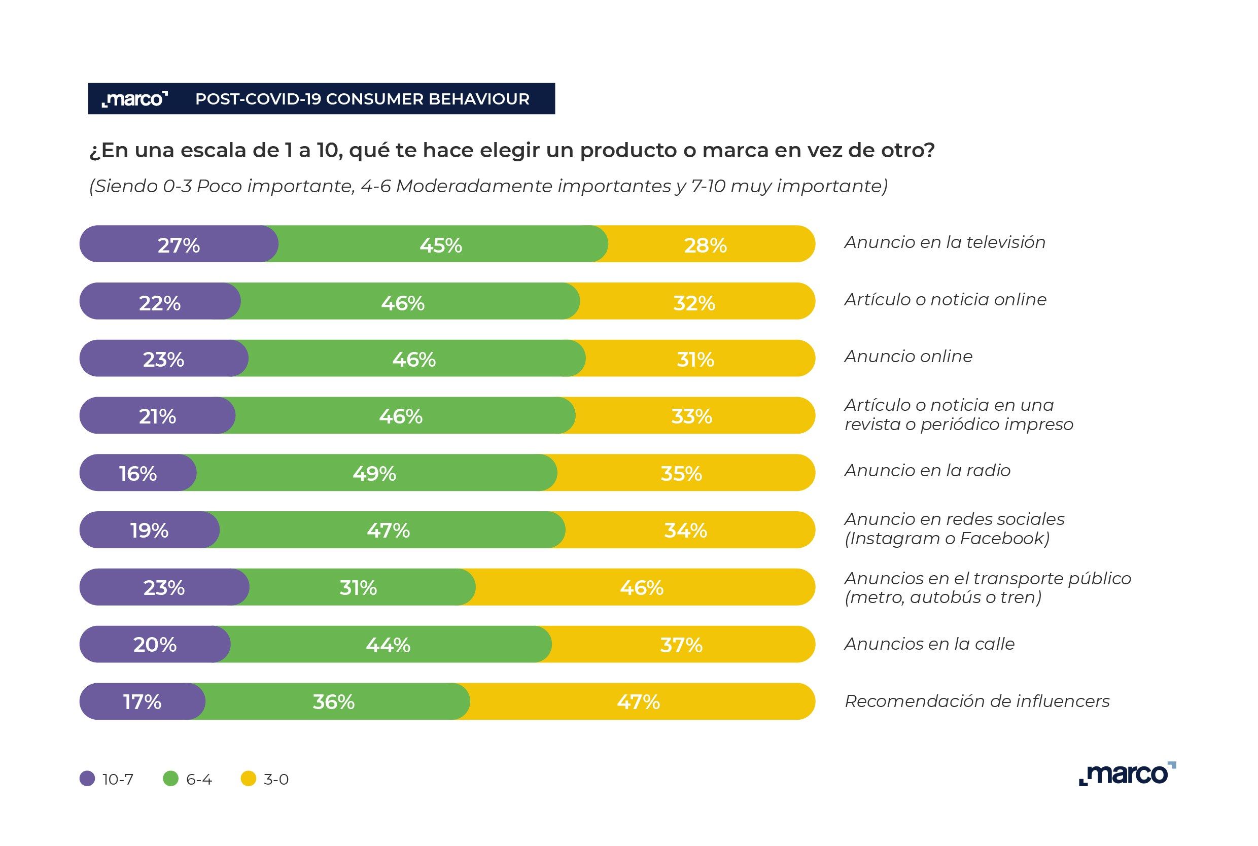 A la hora de cómo conectar con los consumidores, la encuesta revela que los anuncios en televisión, con un 31%, y la prensa online, con un 30%, son los dos canales que más influyen en los europeos a la hora de escoger una marca frente a otra. En el caso español, estas posiciones se mantienen, aunque el efecto de ambos medios de comunicación es más reducido, con un 28% en el caso del televisor y un 25% en el de los digitales.