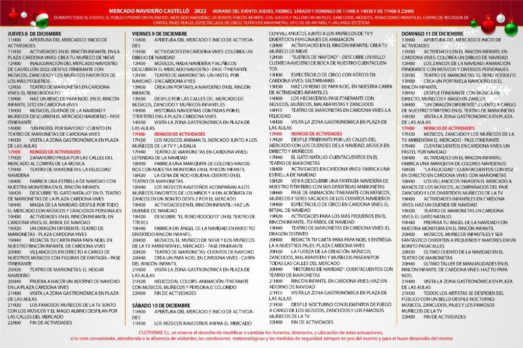 Castelló acollirà el Mercat Nadalenc del 8 a l’11 de desembre. Una proposta que contribuirà a dinamitzar el centre de la ciutat i que ofereix desenes d’activitats per a un públic familiar i una àmplia varietat de productes en les parades instal·lades. Les casetes es muntaran als carrers Major i Cavallers i en la plaça de les Aules; i els tallers es realitzaran en aquestes ubicacions.