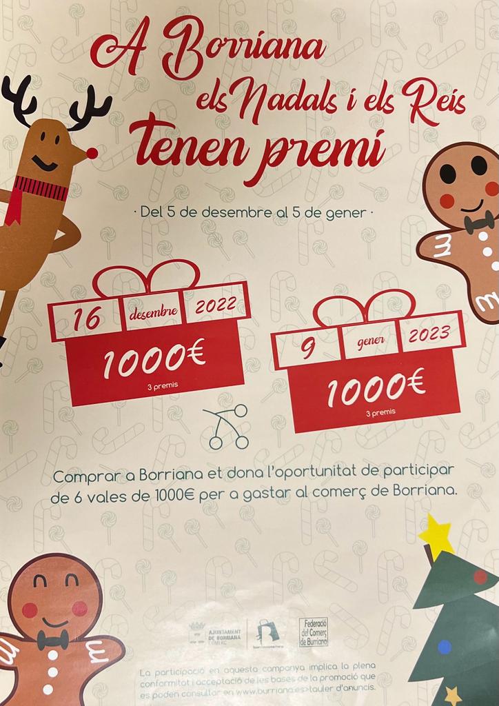 L’Ajuntament de Borriana repartirà aquest Nadal un total de 6.000 euros en sis premis de 1.000 euros entre les persones que realitzen les seues compres en el comerç local de Borriana entre l’entre els dies 5 de desembre de 2022 i 5 de gener de 2023, els dos inclusivament, dins de la campanya “A Borriana, Nadal i Reis tenen premi”, organitzada per a promocionar els comerços minoristes amb establiment obert al públic situats al municipi.