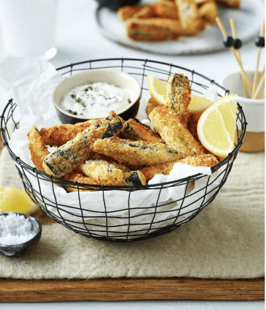 Precalentar el horno. Seleccionar Airfry/Super Convection/ 220ºC/ 12 mins y pulsar START. Una vez precalentado, colocar la cesta en la posición airfry del horno y cocinar durante 12 minutos o hasta que esté dorado y crujiente. Servir inmediatamente con la salsa de yogur con hierbas.