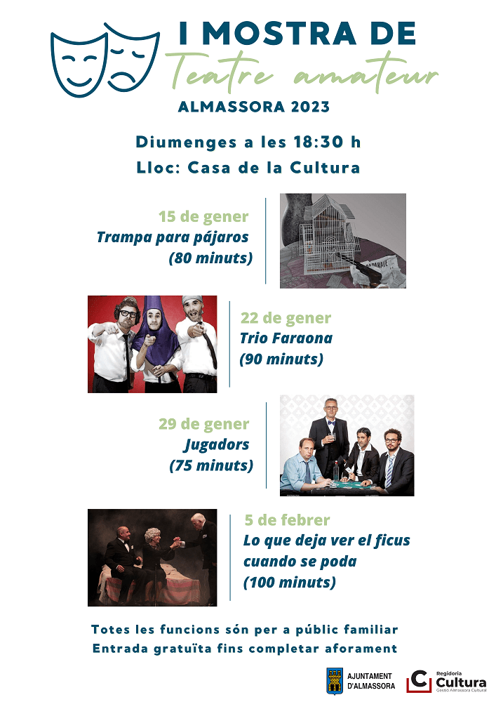 El regidor de Cultura de l’Ajuntament d’Almassora, Javier Mollá, acompanyat pel vocal de la Federació de Teatre Amateur de la Comunitat Valenciana, Antonio Arbeloa, ha presentat la I Mostra a Almassora. La Casa de la Cultura acollirà durant quatre diumenges, des d’aquest fins al 5 de febrer, a quatre companyies artístiques procedents de tota la Comunitat. El públic interessat podrà acudir a partir de les 18.30 hores gratuïtament fins a completar l’aforament. Aquest diumenge és el torn de ‘Trampa para pájaros’ naturals d’Ibi, la setmana que ve ‘Trio Faraona’ de Gandia, el diumenge 29 de gener ‘Jugadors’ de Carcaixent i ‘Lo que deja ver el ficus cuando se poda’ de Castelló.