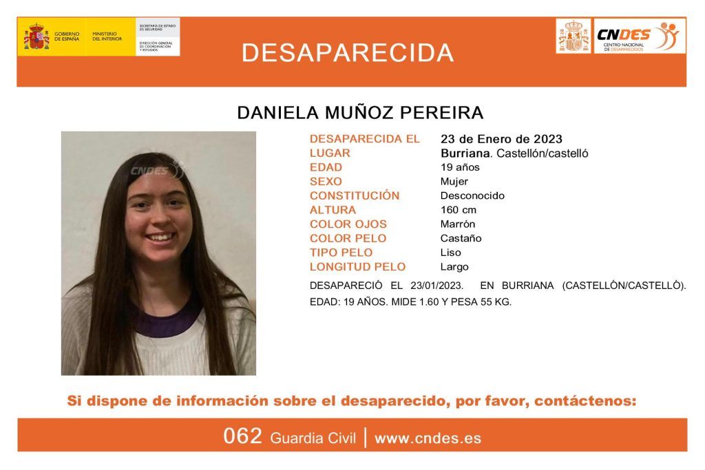 Según publica el Centro Nacional de Desaparecidos, Daniela Muñoz Pereira, una joven de 19 años vecina de Burriana, lleva en paradero desconocido desde ayer lunes.