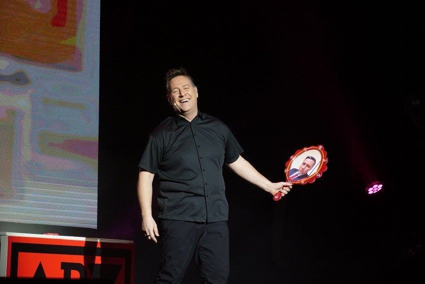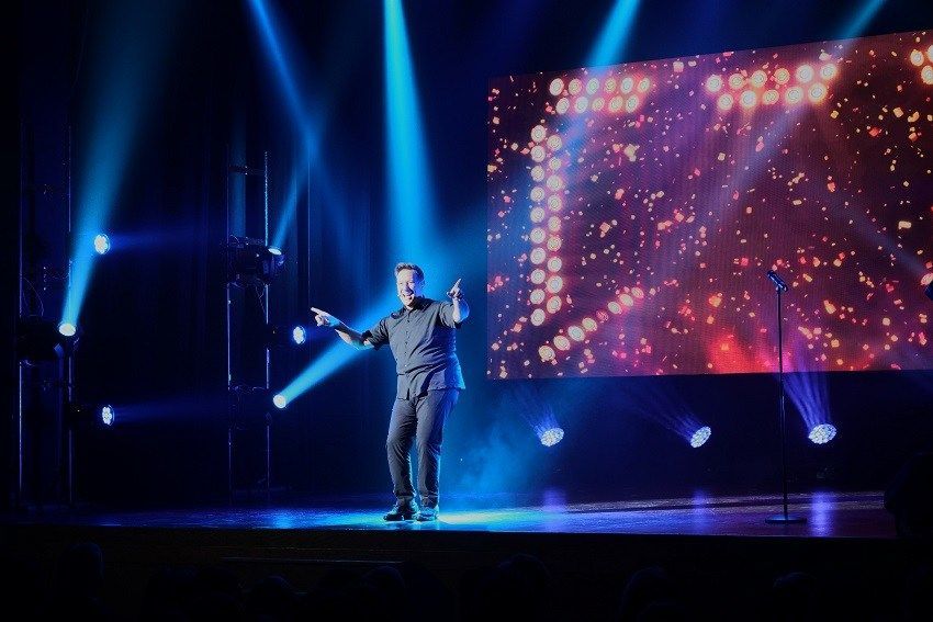 El reconocido showman llegó hasta el auditorio gracias a PORCELANOSA que, en las celebraciones del cincuenta aniversario de la empresa, había programado esta actuación de prestigio totalmente gratis, hasta completar aforo, como regalo para la localidad.