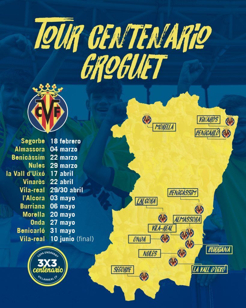 El Villarreal CF ha presentado el Tour Centenario Groguet, un evento impulsado por el club, que organizará distintas actividades por toda la geografía provincial e involucrará en la fiesta del centenario a los municipios de Castellón durante los primeros meses del presente año 2023. La actividad estrella de este novedoso tour provincial, que incluirá más activaciones, será la celebración de la Copa Endavant 3×3.
