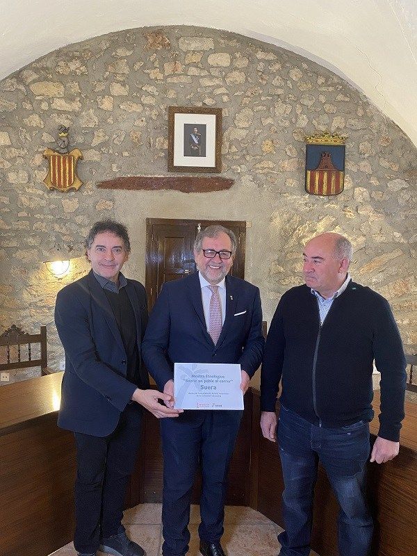 El poble de Suera ha rebut la visita del secretari Autonòmic de Turisme de la Generalitat Valenciana, Francesc Colomer, per a fer entrega de la placa que reconeix la Mostra Etnològica “Suera, un poble al carrer”, com a Festa d’Interés Turístic Autonòmic. L’alcalde de Suera, José Martí, ha sigut l’encarregat de rebre la distinció junt amb el president del Centre Cultural, Enrique Salvador.