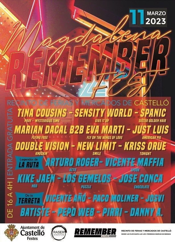 Castelló acollirà el Magdalena Remember Fest el pròxim 11 de març, el primer dissabte de les festes fundacionals. Serà una cita en el Recinte de Fires i Mercats de Castelló, amb entrada gratuïta, que es desenvoluparà ininterrompudament durant 12 hores, des de les 16.00 fins a les 04.00 hores.