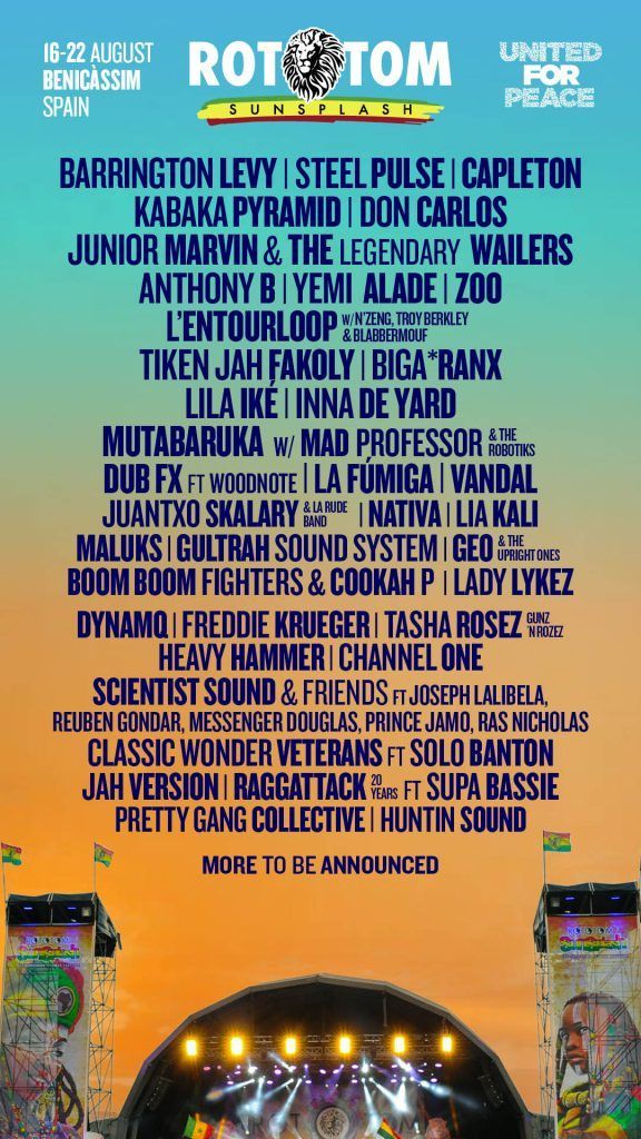 El lienzo musical de la 28ª edición del Festival Internacional Reggae Rototom Sunsplash, que se celebrará en Benicàssim (Castelló, España) del 16 al 22 de agosto de 2023, empieza a cobrar vida. Más de 40 nombres inauguran un cartel que plasma, una vez más, el idiosincrático recorrido que cada año traza la macro cita cultural por la escena reggae planetaria y el amplio abanico sonoro al que da voz. Figuras consagradas conviviendo con artistas y proyectos emergentes. Regresos esperados junto a primeras veces expectantes. Así esculpe Rototom su versátil propuesta para llenar de música, y cultura, el próximo verano.
