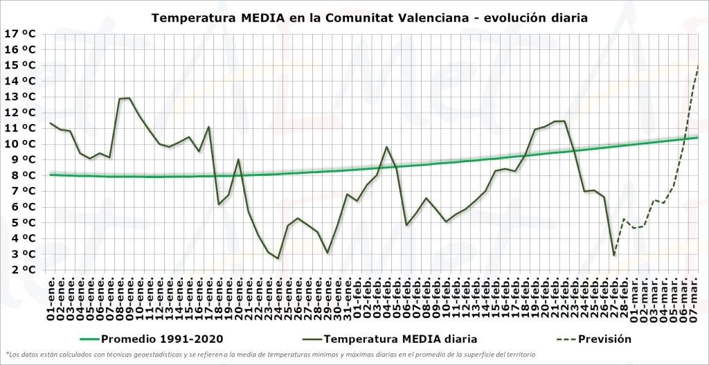 Junto con el 24 de enero, ayer fue el día más frío del invierno en la Comunitat Valenciana. Hoy las temperaturas se han recuperado significativamente, aunque mañana vuelven a caer unos grados, por lo que el ambiente será invernal hasta el final de la semana.