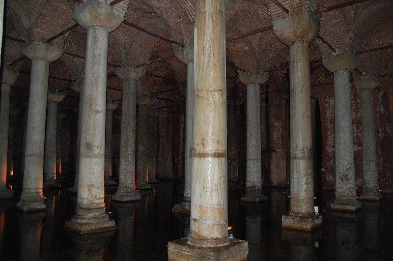 - Yerebatan: Cisterna Bizantina s. VI, llamada el palacio sumergido, y que cuya bóveda esta sostenida por 336 columnas