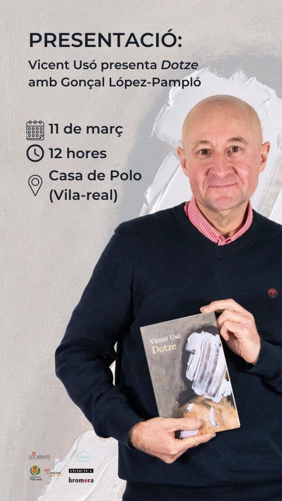 Dissabte que ve, 11 de març, a les 12 h, la Casa de Polo acollirà la presentació de Dotze, l’última novel·la de Vicent Usó. L’acompanyarà Gonçal López -Pampló, professor de la Universitat de València i exdirector literari de Bromera, l’editorial que ha publicat el llibre. L’acte, l’entrada al