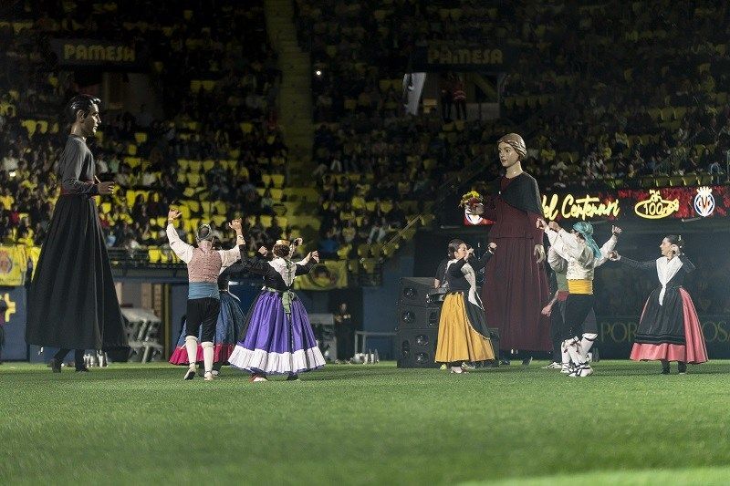 La ‘Festa del Centenari’ del 10 de marzo ha sido una representación artística de los 100 años de historia del club y la ciudad, con guiños socio-culturales a través de distintos componentes teatrales, musicales y audiovisuales. El acto comenzó mostrando las raíces, el contexto social de los años 20’ del siglo pasado -momento de la fundación del CD Villarreal-, con un homenaje a un icono de Vila -real como Francisco Tàrrega con dos músicos locales (chelista Alfonso Rochera y guitarrista Sara Mezquita), que formarán parte del espectáculo que también organizará el club en este centenario a finales del 2023 en honor a Tàrrega. Le prosiguió el ‘Ball de l’Anguila’ como tradición de ocio de la época a través de la Associació Cultural El Trull, dolçainers i tabaleters y el Grup de Danses El Raval, acompañados además por la colla gegantera de Vila -real: Pasqualet, Marigracieta, Jaumet i Pinella.