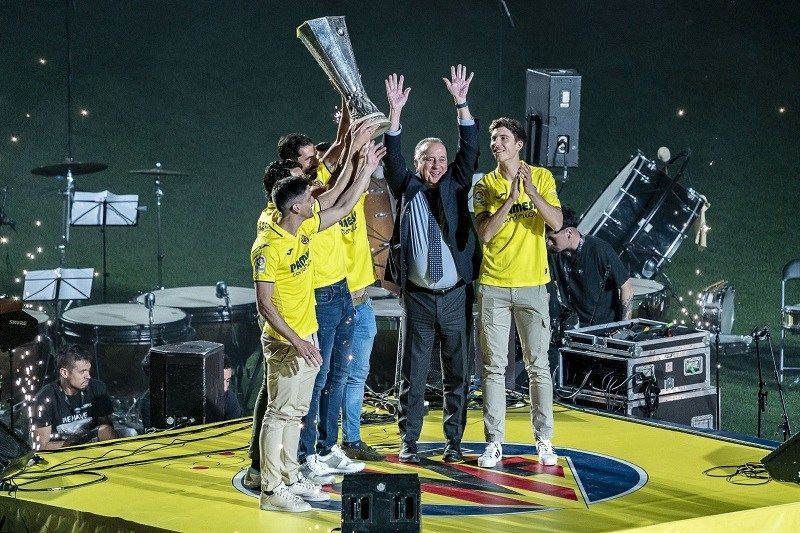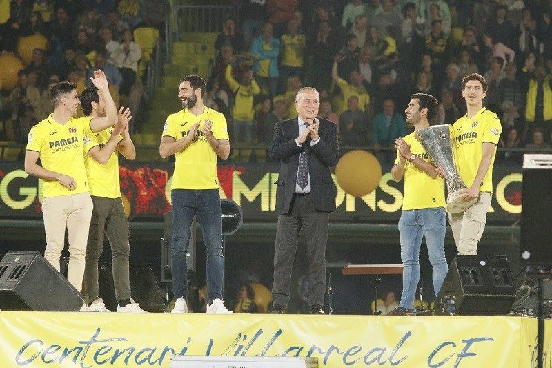 Muy emocionado. El presidente del Villarreal CF, Fernando Roig, levantó la UEFA Europa League junto a los capitanes del equipo y ante la atenta mirada de casi 20.000 groguets, que disfrutaron con la impresionante Festa del Centenari en el Estadio de la Cerámica.