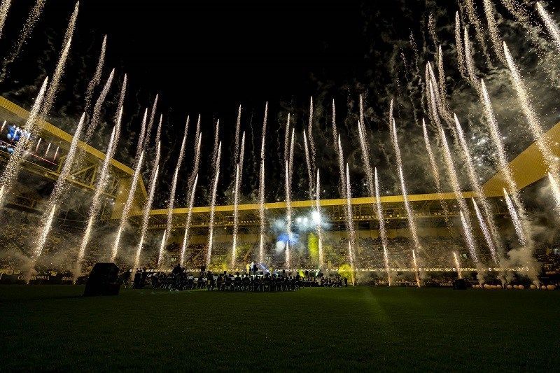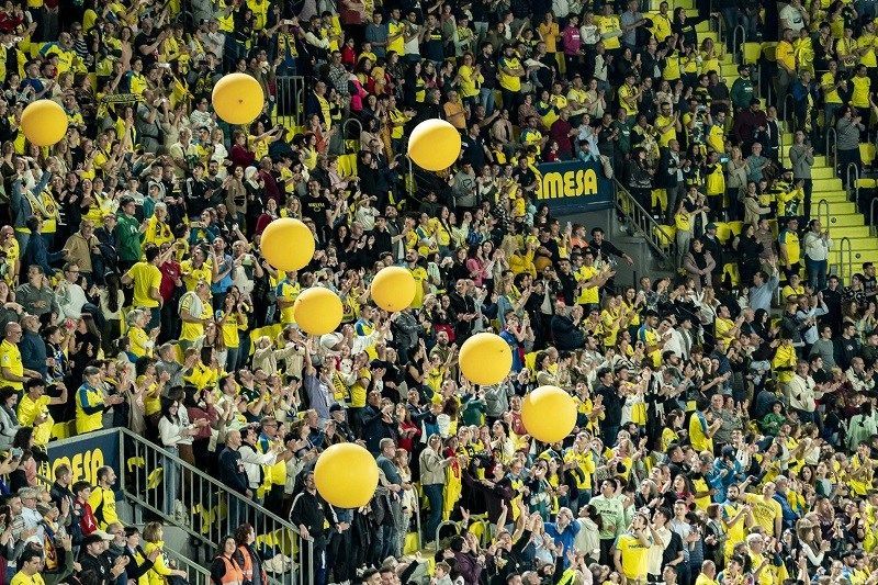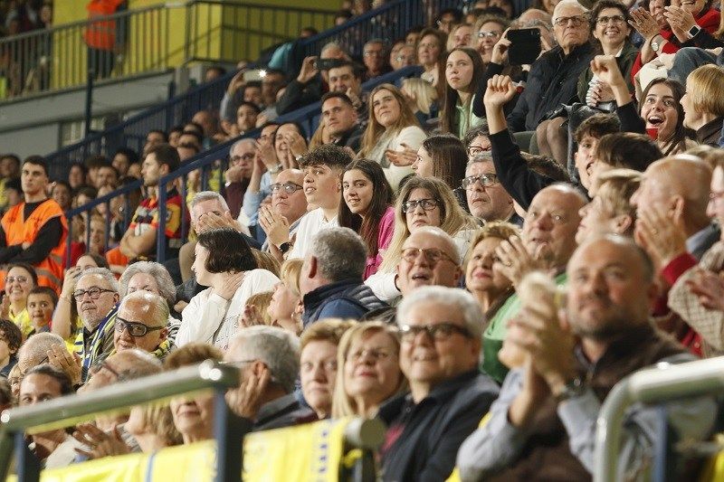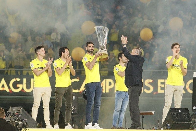 Los capitanes del Villarreal, Raúl Albiol, Manu Trigueros, Gerard Moreno , Dani Parejo y Pau Torres , junto con el presidente Fernando Roig, relucieron el trofeo ante los aficionados y rememoraron aquel día histórico ante la afición. Balones hinchables amarillos por las gradas y pirotecnia. Fiesta total.