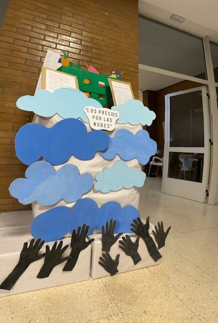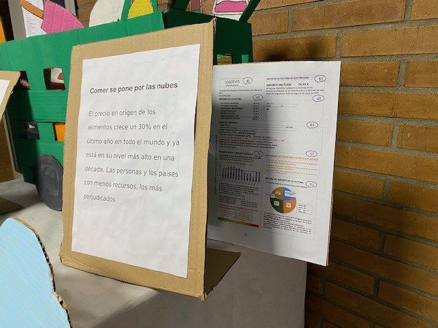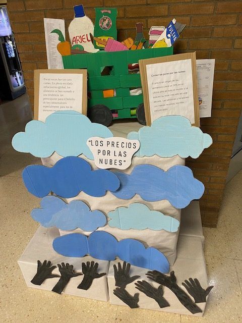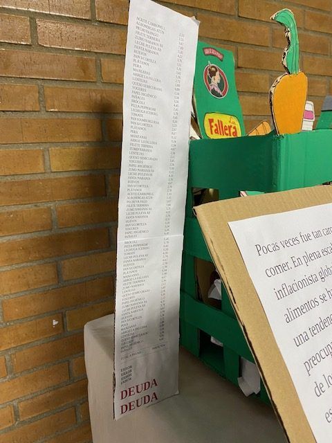 Bajo el título «LOS PRECIOS POR LAS NUBES», simbolizan un carro de la compra situado por encima de las nubes, y sus manos intentando alcanzar a los alimentos. Acompañado por un ticket de la compra con los precios actuales de los alimentos y la deuda que ello implica para el bolsillo de la gente de a pie.