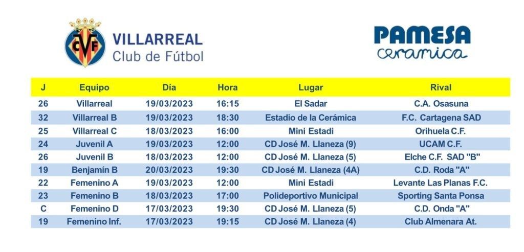 ¡Los equipos del Villarreal CF ya conocen sus horarios de este fin de semana! El primer equipo contra el CA Osasuna en El Sadar este sábado a las 16.15 horas Seguidamente, el Mini Submarino hará lo propio ante el Cartagena en La Cerámica 18.30 horas). Por la mañana, el Villarreal Femenino se verá las caras con el Levante Las Planas en el Mini Estadi (12.00 horas).