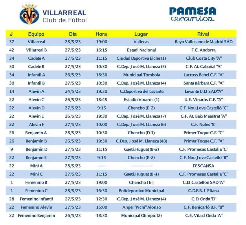El Villarreal CF ya conoce los horarios de todos los partidos que jugarán los equipos del club este fin de semana. Un total de 6 conjuntos groguets ejecerán como locales. Además del partido del primer equipo ante el Rayo Vallecano (domingo, 19.00h), destaca el encuentro del Villarreal B ante el FC Andorra, que se jugará el sábado, a las 16.15 horas, en el Estadi Nacional.