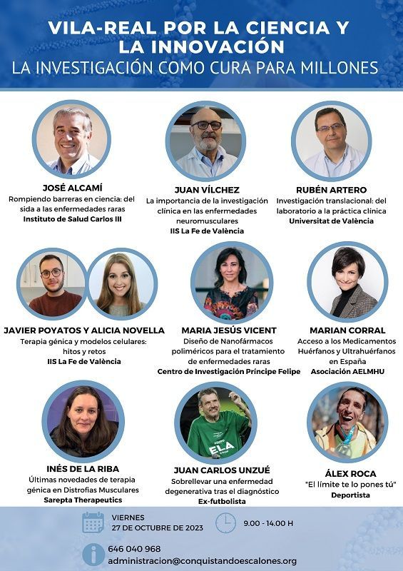 Así, los conferenciantes ya confirmados son José Alcamí (Instituto de Salud Carlos III), Juan Vílchez (IIS La Fe de València), Rubén Artero (Universitat de València), Javier Poyatos y Alicia Novella (IIS La Fe de València), la vila-realense María Jesús Vicent (Centro de Investigación Príncipe Felipe), Marian Corral (Asociación AELMHU) e Inés de la Riba (Sarepta Therapeutics). Entre los temas que abordarán se encuentran la importancia de la investigación clínica en enfermedades neuromusculares, la investigación translacional, la terapia génica, los nanofármacos poliméricos o el acceso a medicamentos huérfanos y ultrahuérfanos. Pero más allá de la esencia científica, el congreso contará con la presencia de ponentes reconocidos por el gran público como son Unzué y Roca .