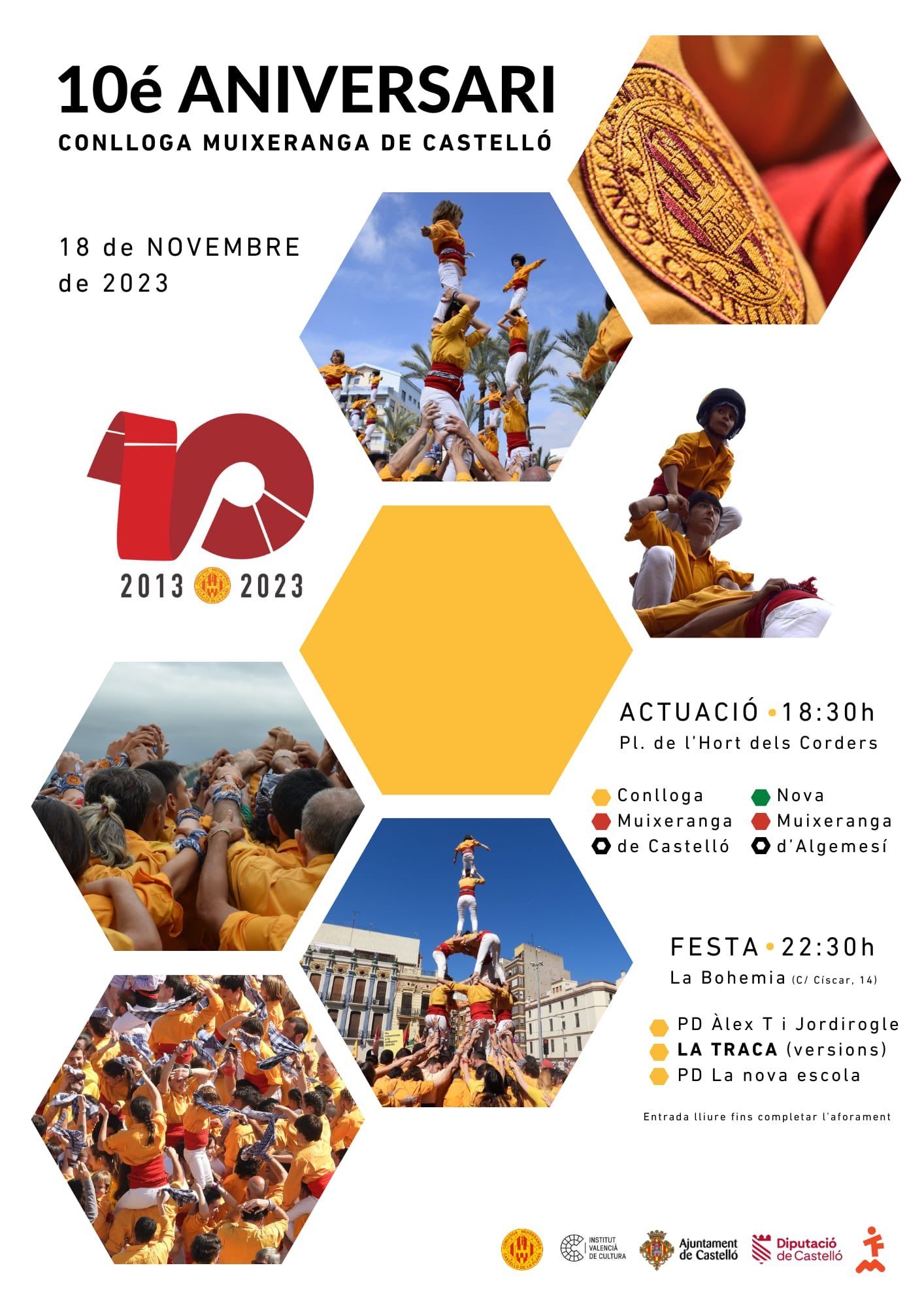 Els actes centrals de l’aniversari seran el dissabte 18 de novembre. S’iniciaran amb una cercavila pels carrers de la nostra ciutat, que arribarà fins a la plaça de l’Hort dels Corders, on la Conlloga actuarà a les 18:30 h acompanyada de la Nova Muixeranga d’Algemesí, entitat reconeguda Patrimoni Immaterial de la Humanitat. Una vegada finalitzada l’actuació, hi haurà un sopar de germanor i concerts oberts a tothom a la sala La Bohèmia.