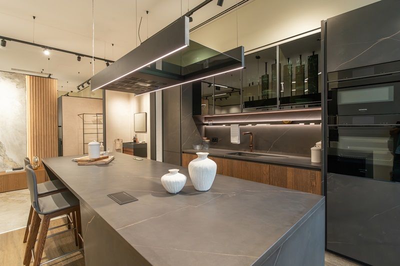 La nueva tienda incorpora algunas de las últimas colecciones de las diferentes firmas de Porcelanosa Grupo, destacando el modelo marmoleado Vendome, o los decorados de Terra, de PORCELANOSA. El cliente también podrá ver la bañera Lounge Fluid, un diseño de Simone Micheli para Noken, o el mosaico de piedra natural Creta Mint, de L’ Antic Colonial. Además, el espacio incorpora una cocina SmartKitchen con la encimera y la isla revestidas con el modelo XTONE Calatorao.