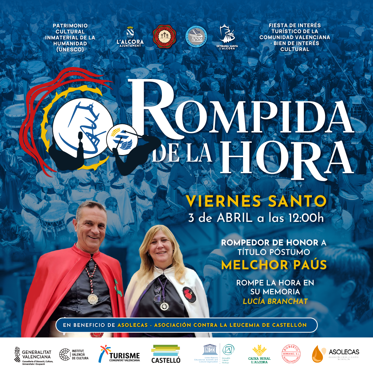 Desde 1991 (primera Rompida de la Hora) cada Viernes Santo, a las 12 del mediodía, l’Alcora se rompe literalmente con la fuerza de cientos de bombos y tambores tocando al unísono en una manifestación sonora del dolor por la muerte de Cristo que contagia una emoción especial a todo aquel que se acerca a vivir y sentir este acto en primera persona. Tras los cuatro golpes iniciales, que este año dará el músico y cantaor valenciano Pep Gimeno ‘Botifarra’ (Rompedor de Honor 2025), el silencio se rompe por completo y da paso al rugir de los tambores y bombos, que hacen vibrar l’Alcora durante una hora.