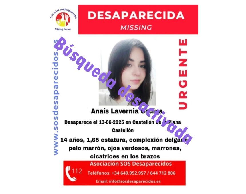 La menor de 14 años, Ana ís Lavernia Codina, desaparecida desde el pasado viernes 13 de junio en la localidad de Vila -real, ha sido localizada en buen estado.