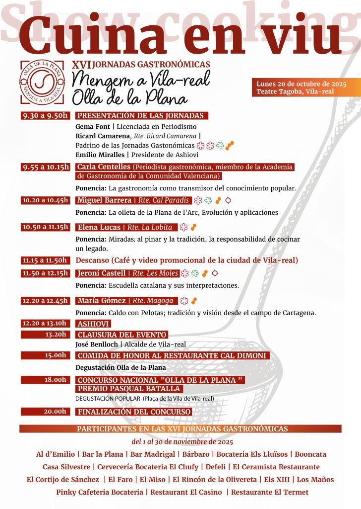 Un dels esdeveniments més esperats d’aquestes jornades és la realització del showcooking (cuina en viu) que comptarà amb la presència de diferents xefs amb estreles Michelin i que es durà a terme el dilluns 20 d’octubre a partir de les 9.30 h al Teatre Tagoba de Vila -real. Aquest acte estarà coordinat pel prestigiós xef Ricard Camarena (Restaurant Ricard Camarena, València), guardonat amb dues Estrelles Michelin, una Estrella Verda i tres Sols Repsol, a més de ser reconegut com el 6é millor restaurant vegetal del món. Amb tot, el cartell de ponents suma altres 4 Estrelles Michelín, 8 Sols Repsol, 2 Estrelles Verdes Michelín i dues distincions We’re smart amb la participació de Carla Centelles, periodista gastronòmica i CEO de Terrenae; Miguel Barrera (Cal Paradís, Vall d’ Alba ); Elena Lucas (La Lobita, Sòria); Jeroni Castell (Les Moles, Ulldecona) i María Gómez (Magoga, Cartagena).