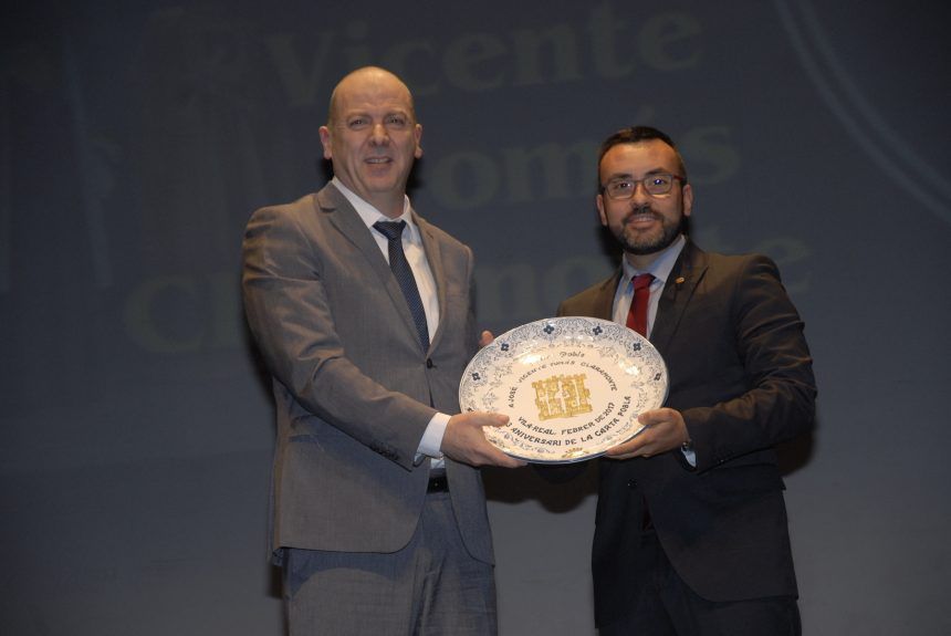 Foto: José Benlloch, alcalde de Vila-real, li fa lliurament a José Vicente Tomás Claramonte del Premi Poble 2017.