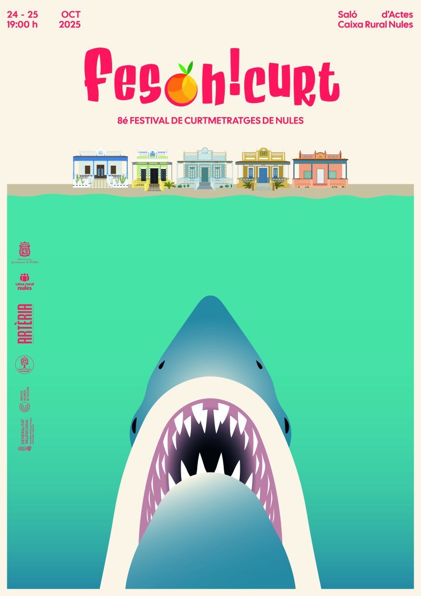 El cartel oficial de esta edición, diseñado por Àngela Moya, rinde homenaje al 50º aniversario de Tiburón y convierte al mítico tiburón en una metáfora sobre la necesidad de preservar Les Casetes de la mar de Nules.