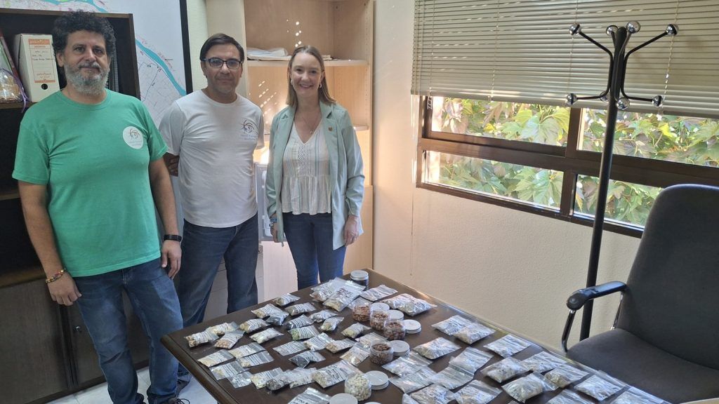 La regidora de Medi Ambient i vicealcaldessa, Maria Fajardo, ha compartit avui amb els responsables de l’ONGD Pankara EcoGlobal l’engegada de la “còpia de seguretat” del banc de llavors creat als horts urbans de Vila -real. Óscar Climent i Juan David Felip, de Pankara, han explicat que actualment disposen de més de 350 varietats registrades al banc existent, hi ha altres en procés de registre, i que, per seguretat, resulta interessant tenir una mostra de les varietats més selectes en un altre espai per a descentralitzar.