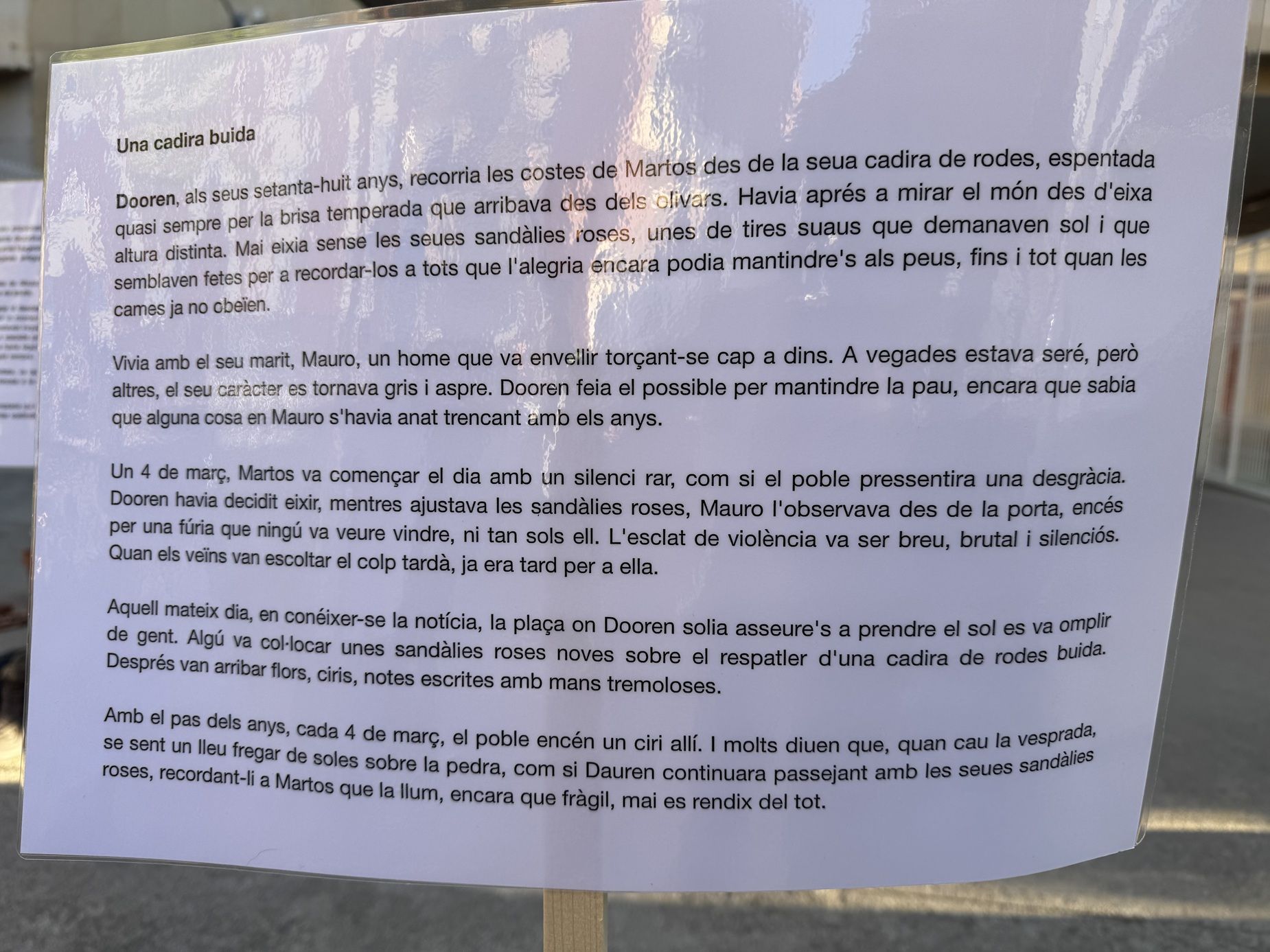 L’espai d’entrada acollia diversos parells de sabates buides, cada un acompanyat per un text que narrava la història ficcionada d’una dona assassinada aquest any a mans de la seua parella o exparella. Les narracions, basades en dades reals com el nom, l’edat o la localitat d’origen de les víctimes, busquen donar rostre i veu a unes vides truncades que massa sovint queden reduïdes a estadístiques.
