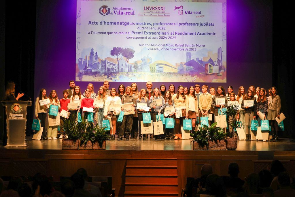 Vila -real ha celebrat la gala amb motiu del Dia Internacional de les Ciutats Educadores organitzada per la Regidoria d’Educació, amb la col·laboració de la Fundació Caixa Rural Vila -real, i en la qual s’han lliurat els reconeixements als Premis Extraordinaris al Rendiment Acadèmic d’educació primària i secundària del curs 24/25 i s’ha retut homenatge als docents dels centres de Vila -real jubilats l’any 2025. En total, s’han lliurat 31 reconeixements a estudiants i 22 a mestres, tots no han pogut assistir a l’acte, que han finalitzat enguany la seua trajectòria docent.