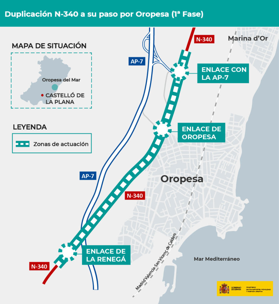 - Rediseño completo del semienlace que da servicio al casco urbano de Oropesa del Mar, con el fin de mejorar la conexión interior y reducir los conflictos de tráfico en las horas de mayor intensidad.