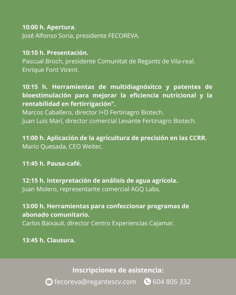 La Federación de Comunidades de Regantes de la Comunidad Valenciana (FECOREVA) organiza la “I jornada de fertirrigación Enrique Font Jericó” el próximo día 23 de diciembre de 2025 en el salón social de la Comunitat de Regants de Vila -real (Av. La Murà, 9).