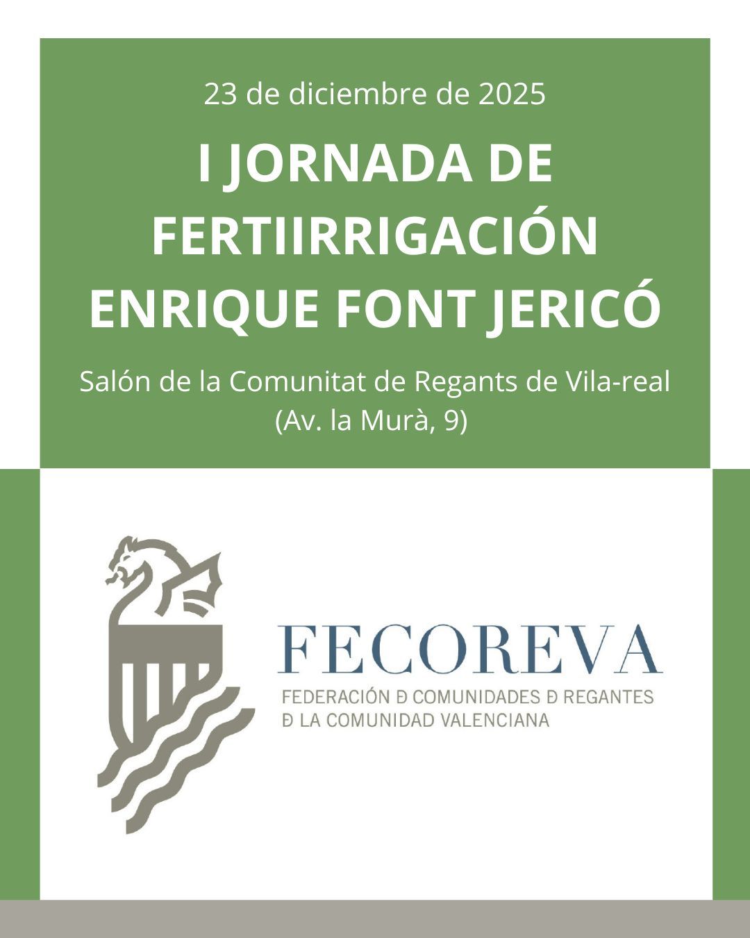 La Federación de Comunidades de Regantes de la Comunidad Valenciana (FECOREVA) organiza la “I jornada de fertirrigación Enrique Font Jericó” el próximo día 23 de diciembre de 2025 en el salón social de la Comunitat de Regants de Vila -real (Av. La Murà, 9).