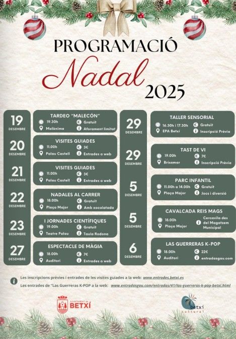 Los días 20 y 21 de diciembre se ofrecen Visitas al Palau , una oportunidad para conocer mejor algunos espacios emblemáticos del municipio, fomentando la cultura local y el patrimonio histórico de Betxí.