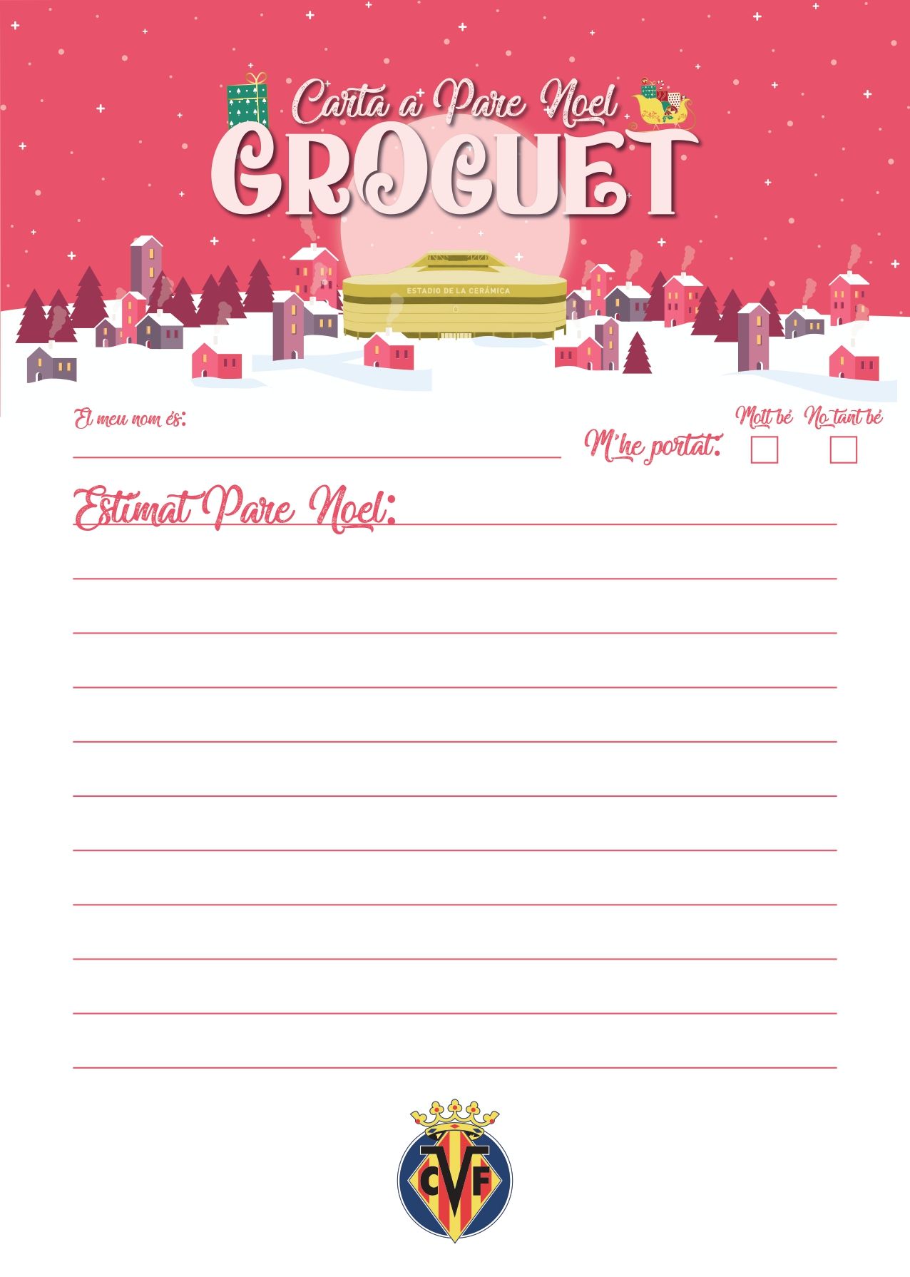 Para la ocasión, el Villarreal CF ha diseñado una carta especial, pensada exclusivamente para los groguets. Se puede descargar de forma totalmente gratuita desde el pie de la noticia o solicitarla en las Tiendas Oficiales del Villarreal CF, facilitando así que ningún pequeño se quede sin entregar su mensaje navideño.