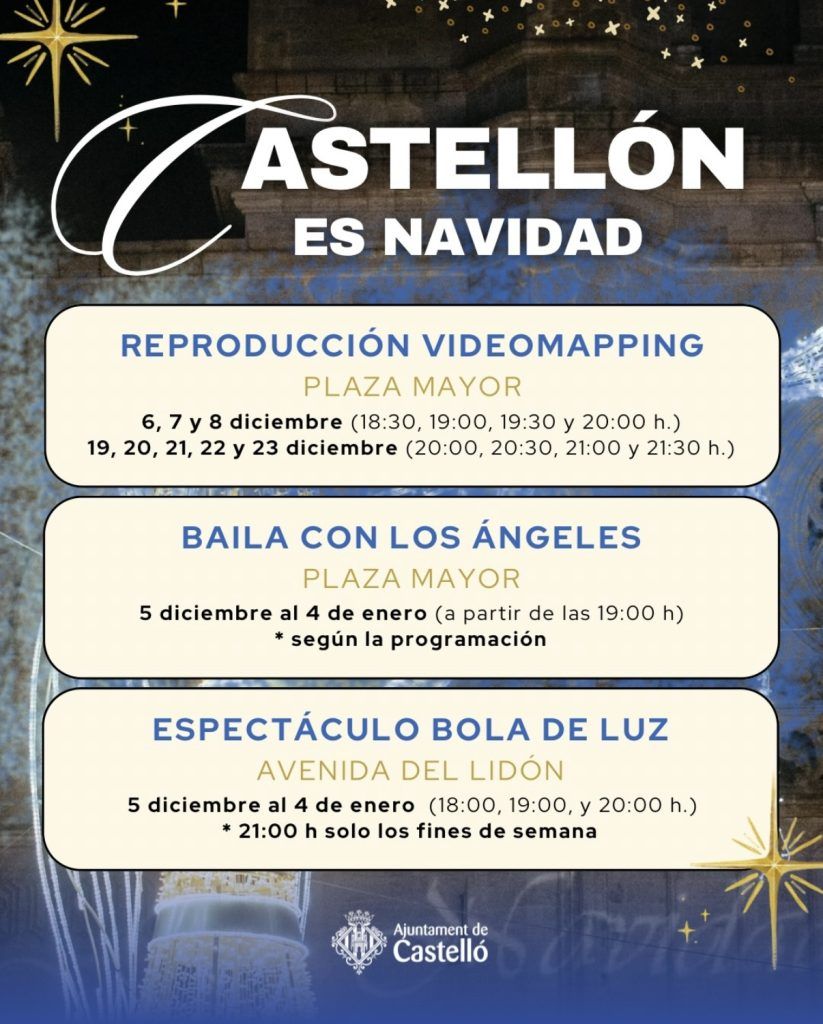 Una agenda luminosa que despide el videomapping del Ayuntamiento de Castellón, pero que mantiene viva la magia de la Navidad con su gran agenda cultural y los más de 250 actos programados para estas fechas en distintos puntos de la ciudad durante los próximos días.