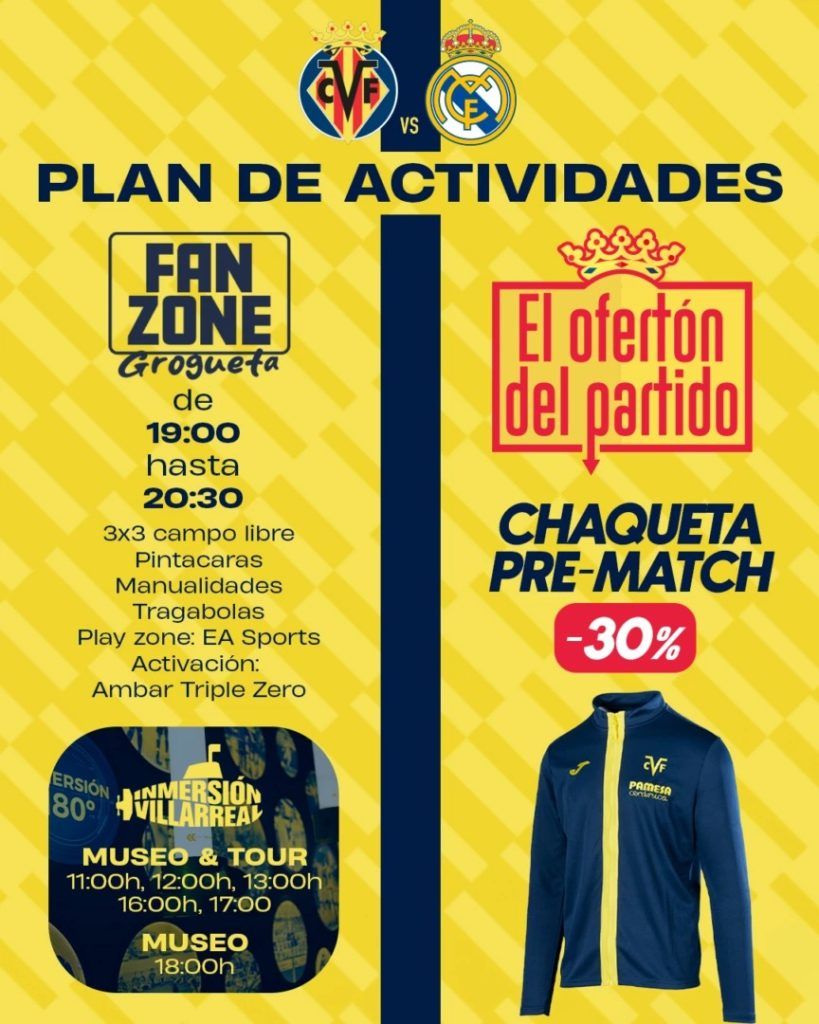 El Villarreal CF volverá a habilitar su habitual Fan Zone en la plaza del Estadio de la Cerámica con motivo del encuentro frente al Real Madrid, correspondiente a la jornada 21 de LALIGA EA Sports. El partido se disputará este sábado 24 de enero, a las 21.00 horas, en el feudo amarillo.