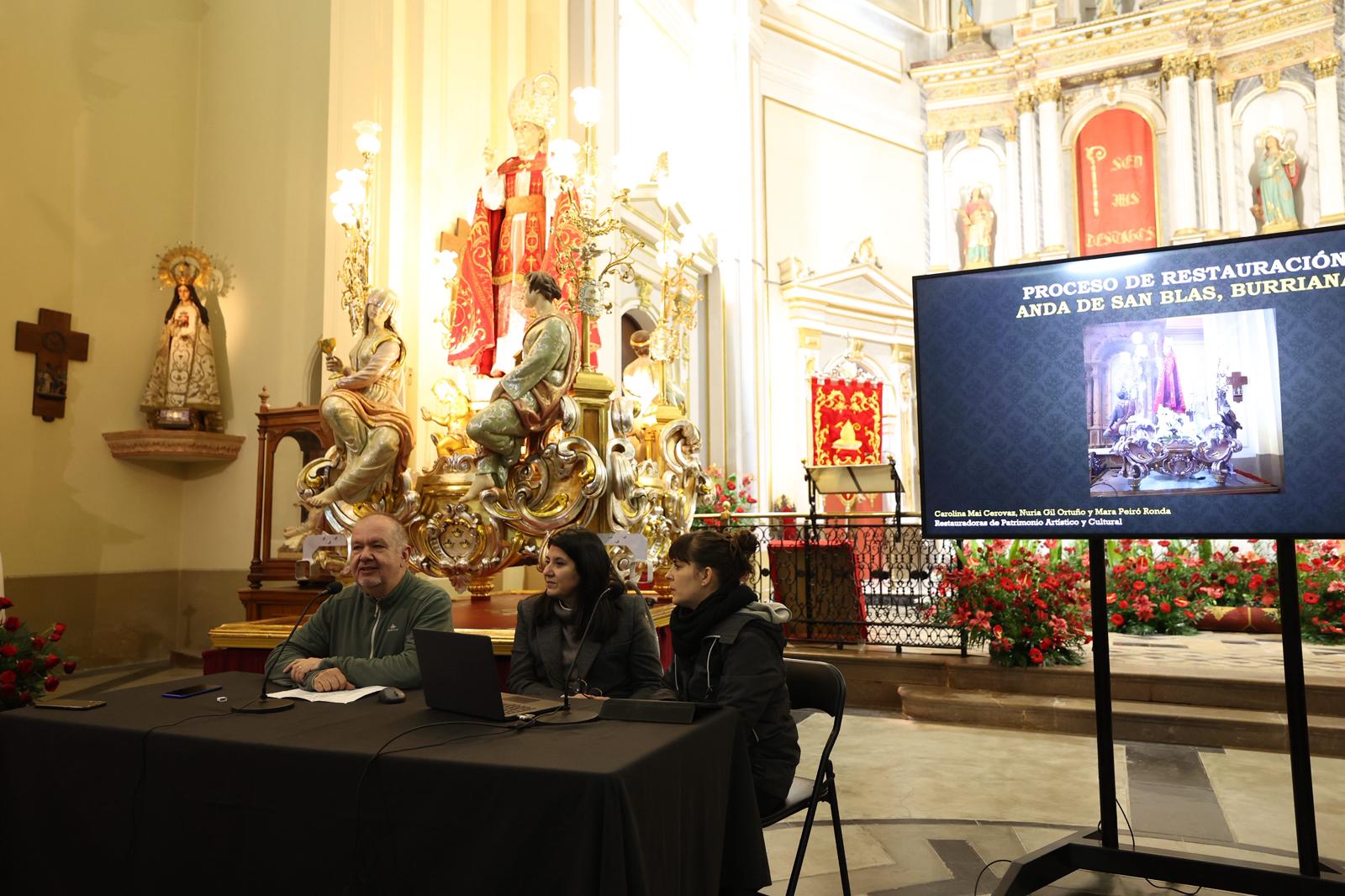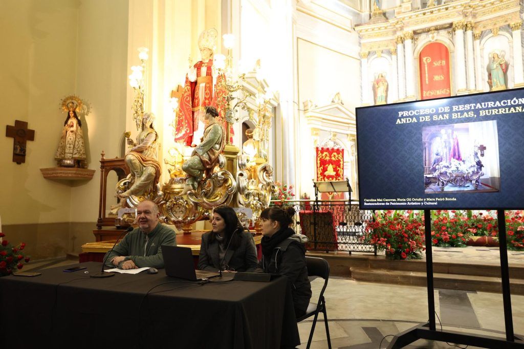 A partir de les 19.00 hores, el foc de les jornades s’ha traslladat a l’Església de Sant Blai, on ha tingut lloc un cicle de conferències tècniques. La primera ponència, titulada “La restauració de la peanya de Sant Blai”, ha sigut a càrrec de les expertes Nuria Gil Ortuño, Carolina Mai Cerovaz i Mara Peiró Ronda, que han detallat a la perfecció el procés d’intervenció i recuperació d’este element d’alt valor simbòlic per a la ciutadania.
