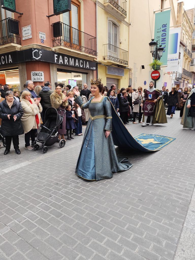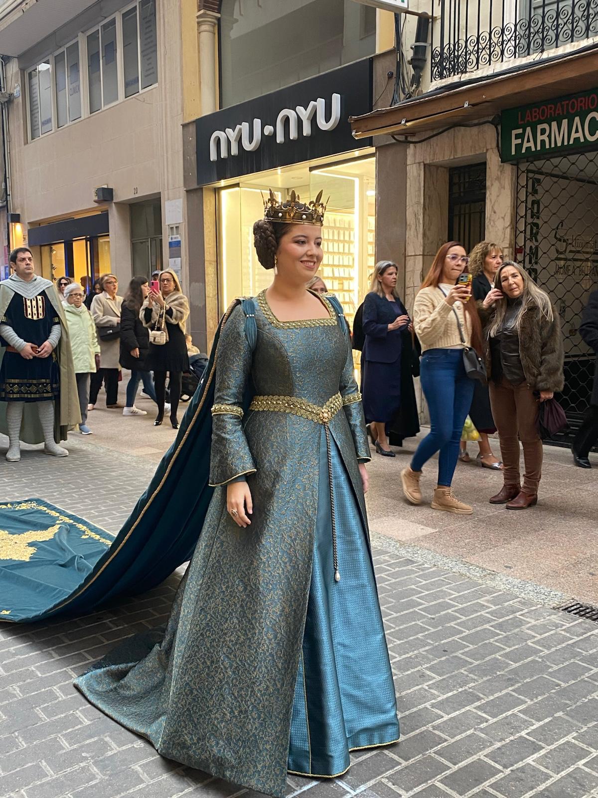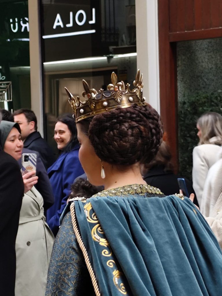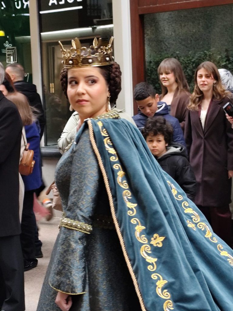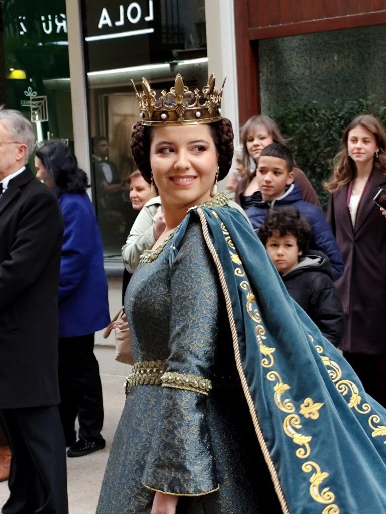 Se descubre el secreto mejor guardado: el traje de Na Violant d’Hongria 2026. Con la expectación y la solemnidad que supone esperar la salida de una reina, Victoria Arcos Vicente , quien encarna este año a la que fuera esposa de Jaume I, ha salido puntual desde la calle Enmedio para desfilar junto a su comitiva hasta el Teatro Principal donde será proclamada oficialmente Na Violant d’Hongria 2026.