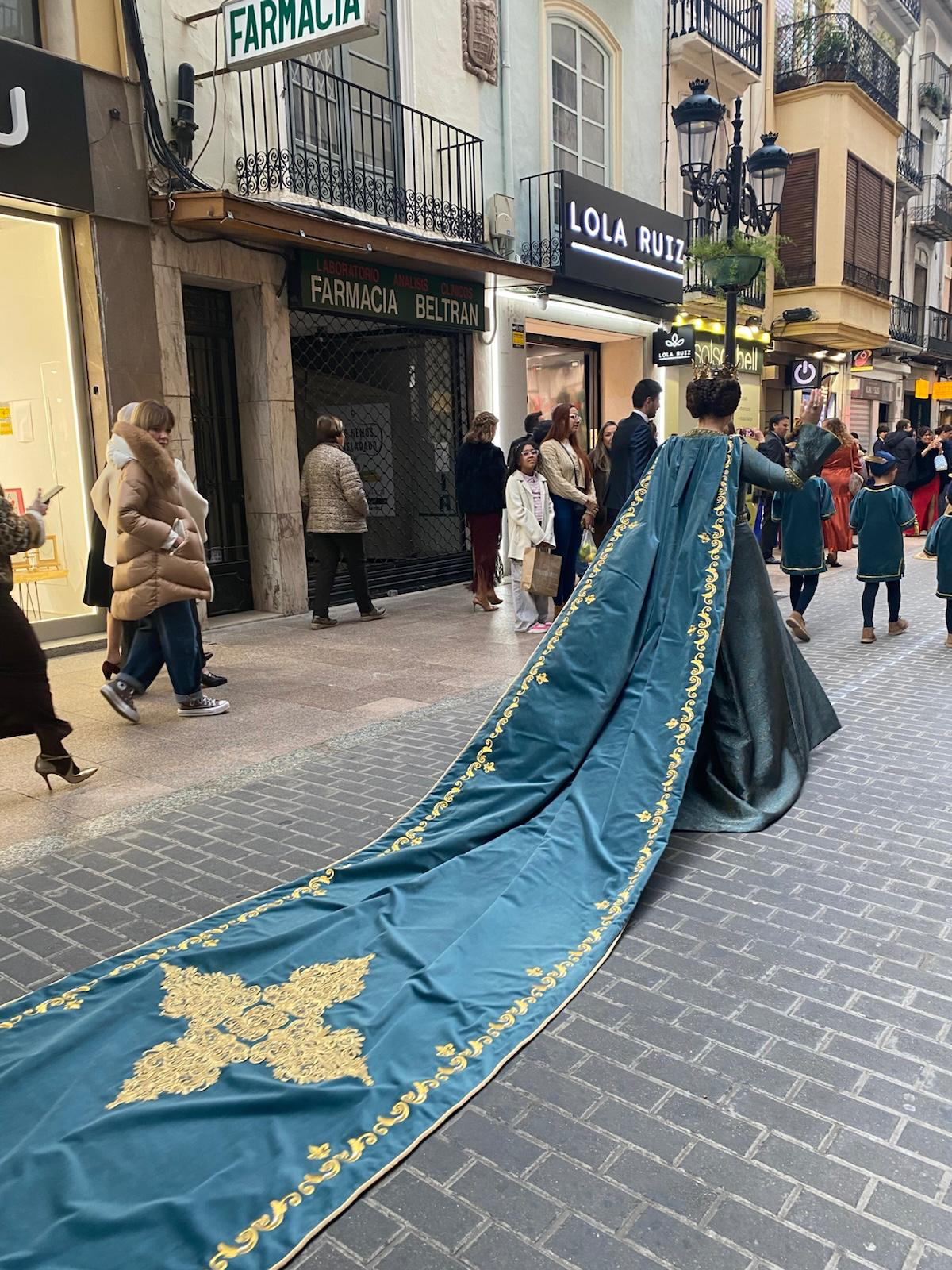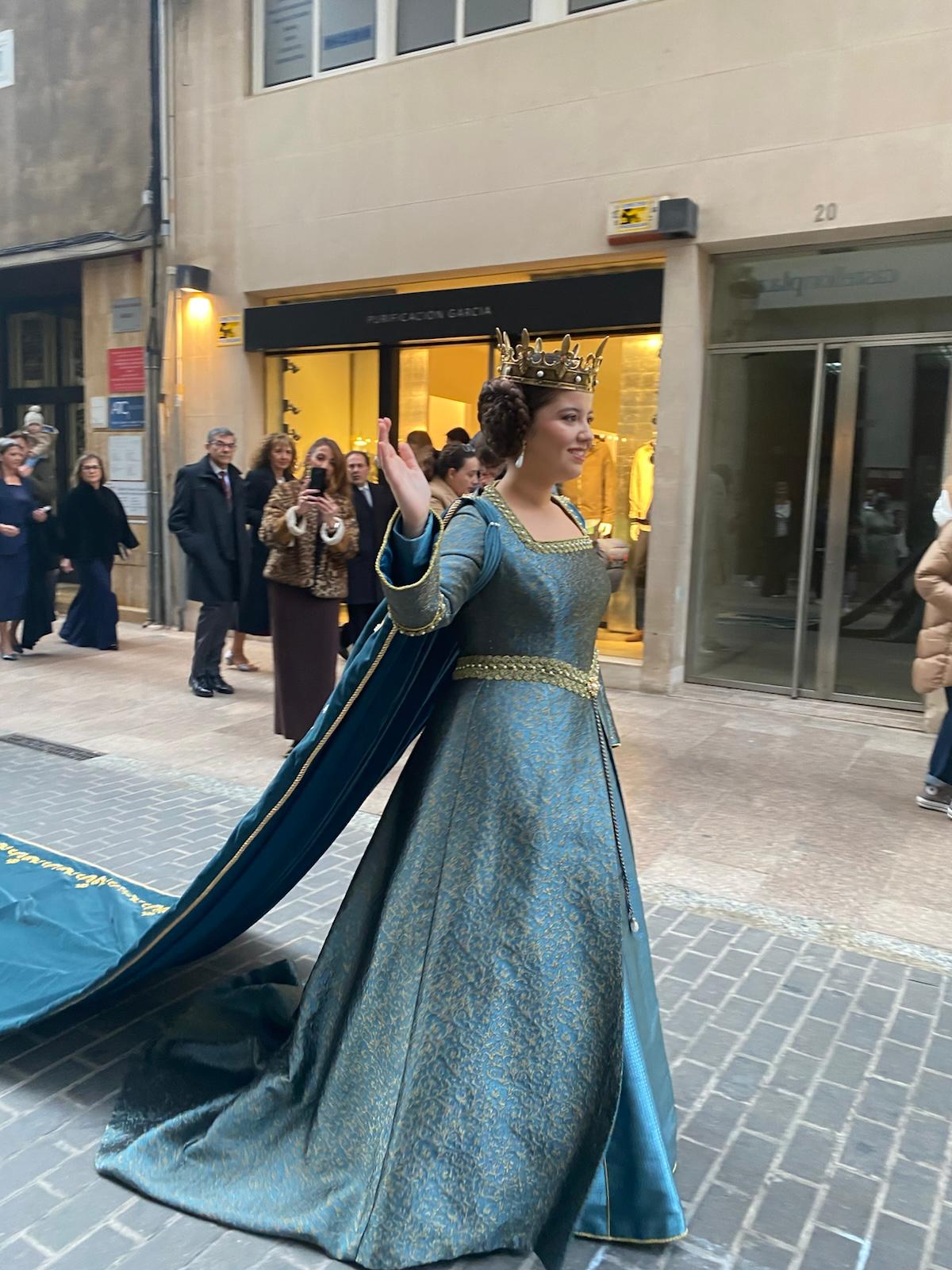 El diseño del traje, en tonos de azul, marca una silueta sencilla y sobria que realza aún más la espectacularidad de la capa. Con peinado clásico de la época y corona, Victoria , Na Violant 2026, ha desfilado ante la curiosidad de quienes la aplaudían y la acompañarán en este acto tan esperado de la proclamación.