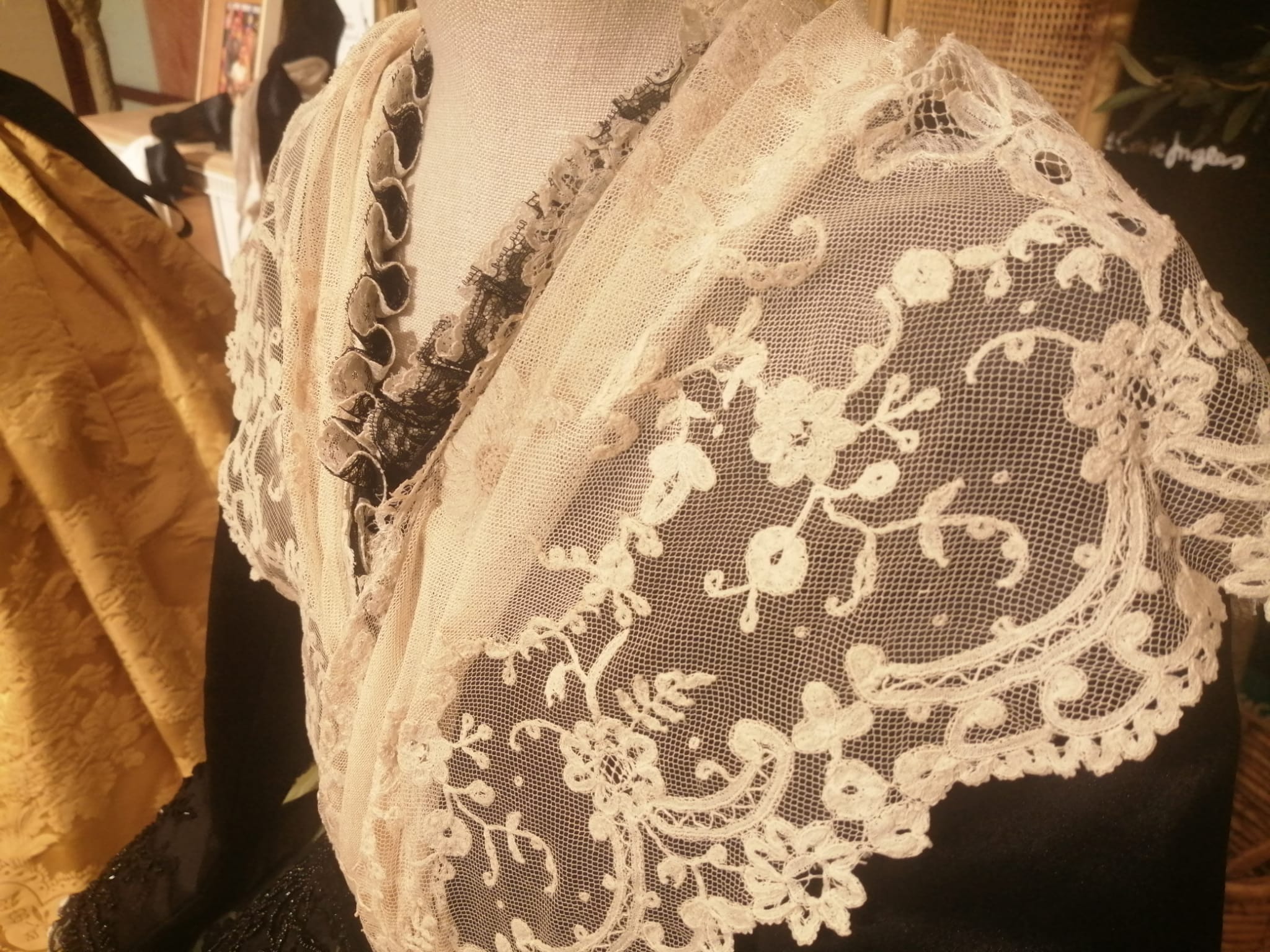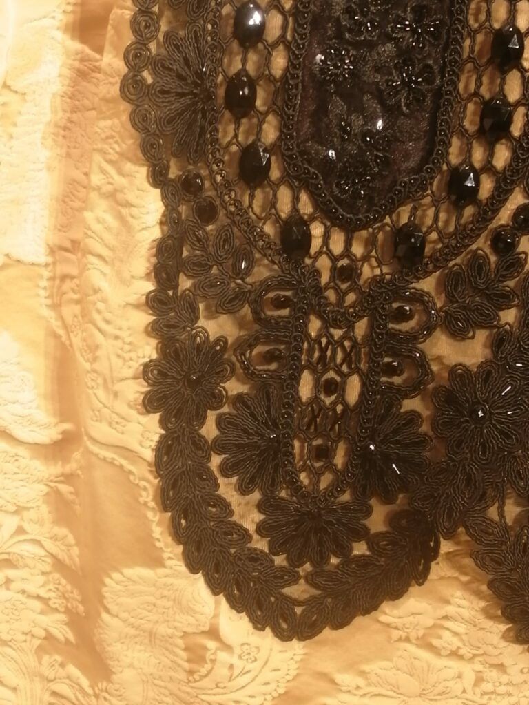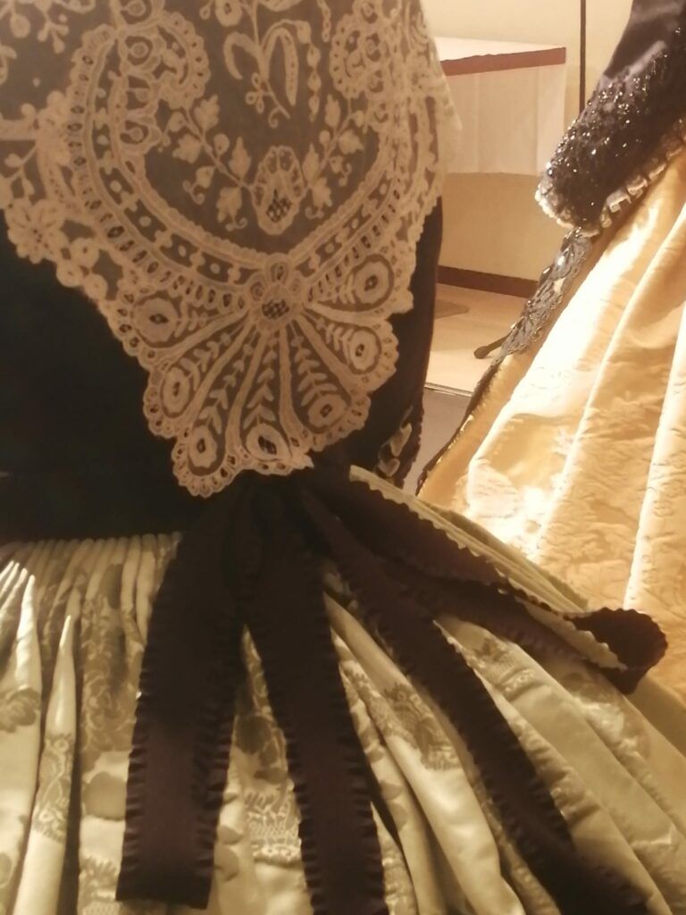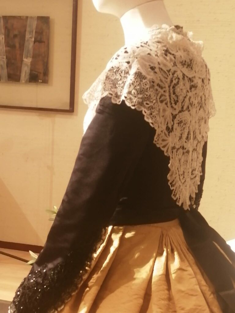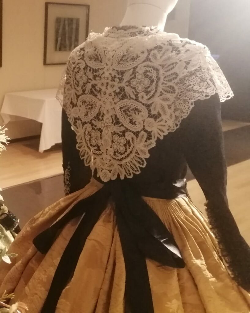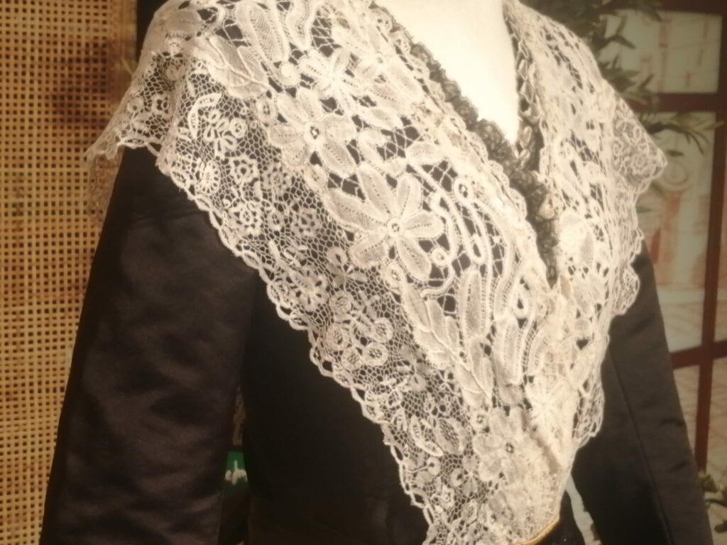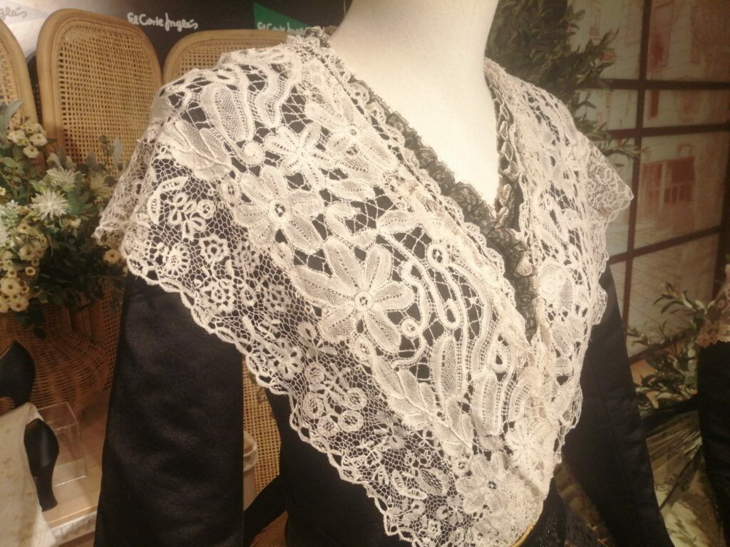 Clara ha escogido un color oro viejo para la falda. En cuanto a las mantelerías están confeccionadas a mano a base de encajes del siglo XIX todas cosidas a mano. Al igual que los delantales y las bocanadas, también bordadas. En el caso de los delantales, además de azabache y pedrería combinan con terciopelo