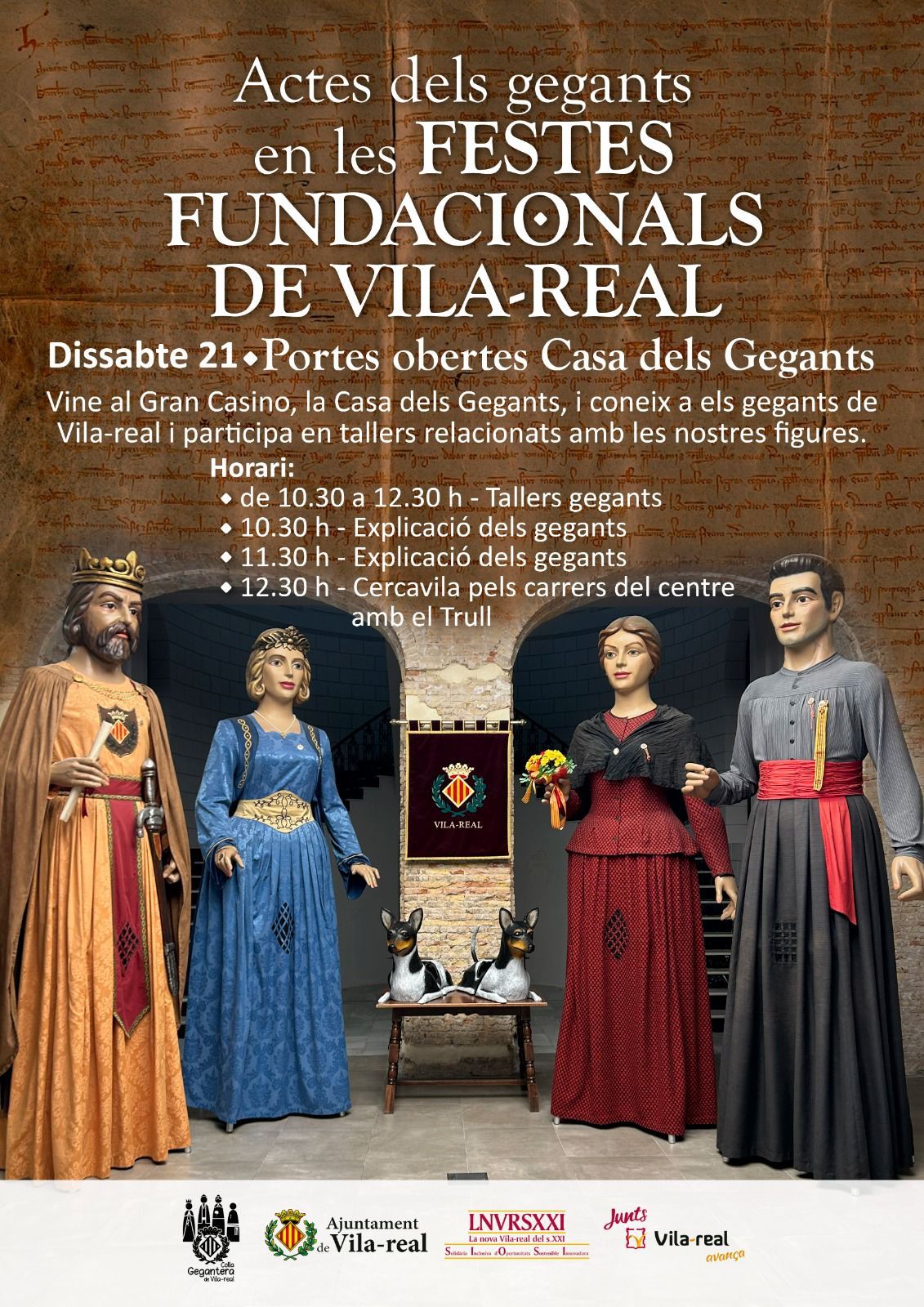 Els actes començaran el dissabte 21, amb una jornada de portes obertes a la Casa dels Gegants, ubicada al Gran Casino. Durant el matí, d’10.30 a 12.30 hores, s’oferiran tallers infantils relacionats amb aquestes figures tradicionals, així com diverses explicacions sobre els gegants de Vila -real, programades a les 10.30 i a les 11.30 hores. La jornada culminarà amb una cercavila pels carrers del centre, que omplirà la ciutat de música, color i tradició.