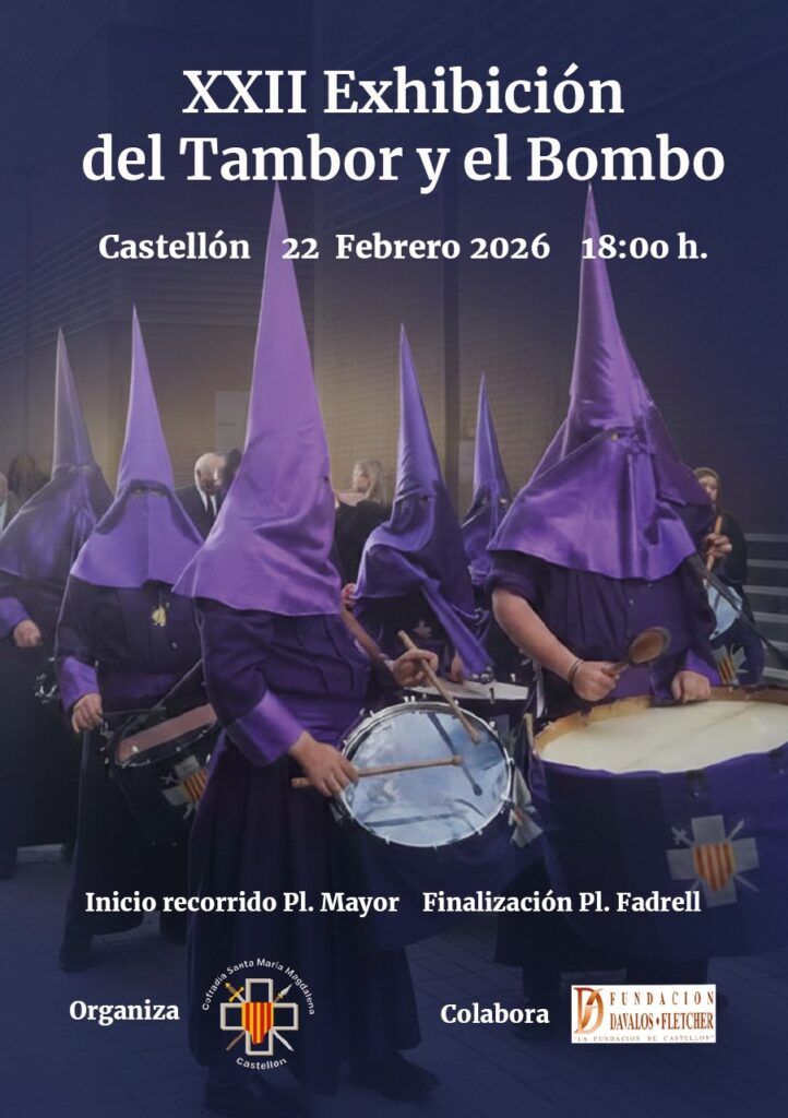 En este caso, será la cofradía de Santa Maria Magdalena, en la iglesia de Sant Vicent Ferrer , la anfitriona del encuentro. La sección de bombos y tambres de la cofradía, junto con los otros cofrades de distintos puntos de la provincia, desfilarán ataviados con sus vestas, desde la plaza Mayor hasta la plaza Fadrell.