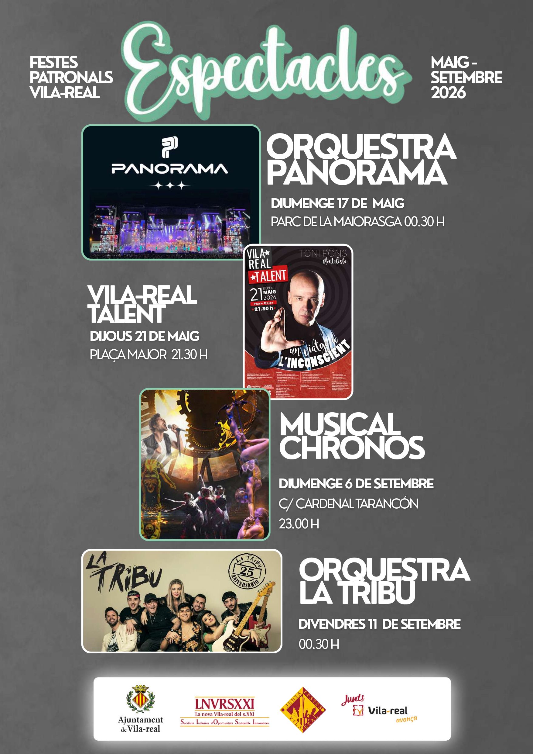 A més, la programació inclou espectacles com el musical Chronos, l’actuació de l’Orquestra La Tribu i una nova edició de Vila -real Talent, aparador de la creativitat i la força artística local. En aquest marc, destaca la participació del mentalista Toni Pons com a artista convidat, reforçant l’aposta per disciplines escèniques diverses i de qualitat.