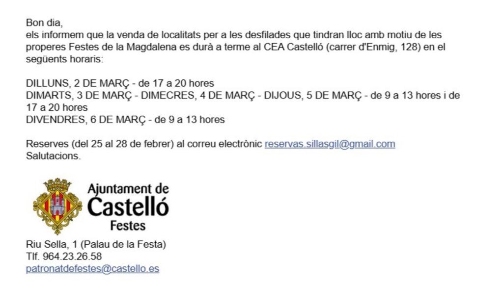 Las sillas para presenciar los principales desfiles de esta Magdalena ya están disponibles. Así lo anuncia una notificación del Patronato de fiestas. Además de para el Pregó, la Desfilada de Gaiates , el Pregó infantil y el Desfile de Animación, ese año también habrá sillas en el desfile extraordinario de Moros d’Alqueria del sábado 14, a las 20:30 horas.