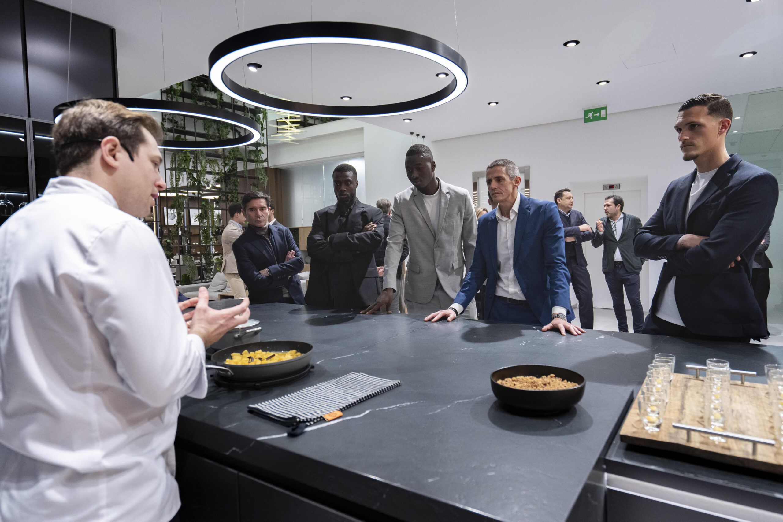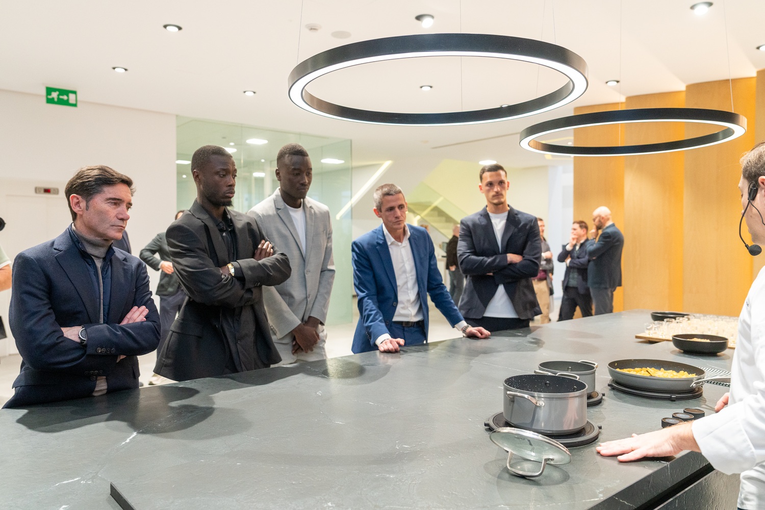 El chef Nacho Barcos, de Grupo Capicúa, ha realizado un showcooking a la representación del equipo, cocinando manzana caramelizada con crumble de avellana y espuma de toffee.