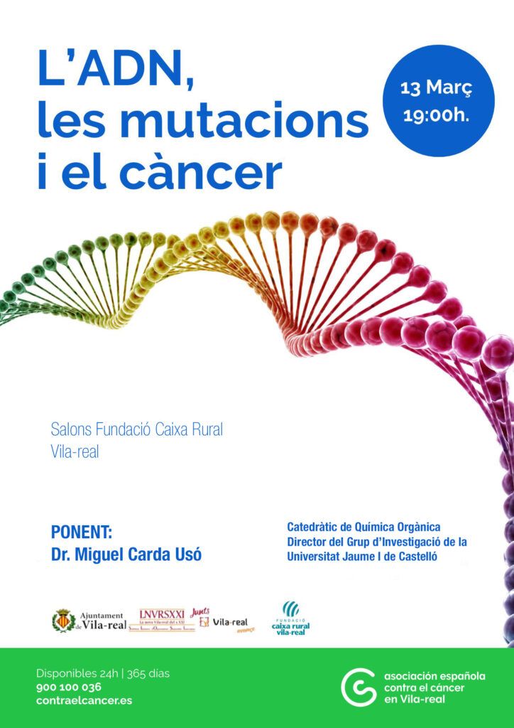 L’Associació Espanyola Contra el Càncer (AECC) a Vila -real ha organitzat una nova activitat divulgativa centrada en la investigació científica i la prevenció del càncer. El pròxim 13 de març a les 19.00 hores, els Salons de la Fundació Caixa Rural de Vila -real acolliran la conferència titulada “L’ADN, les mutacions i el càncer”, una xarrada oberta al públic que pretén acostar el coneixement científic a la ciutadania.