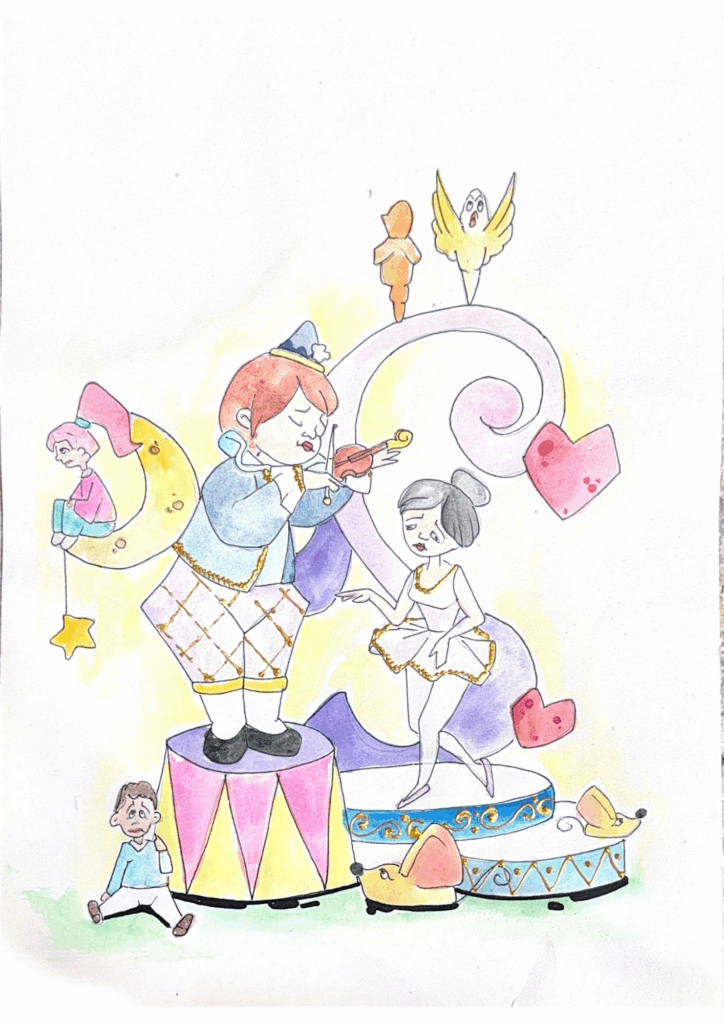Paula explica que el lema és “Instruments, Notes, Emocions i Somnis”, un projecte de Francisco Fuentes Moreno amb crítica de la mateixa comissió. “És un món de música i fantasia”, comenta la comissionada. A dalt del tot, un violí fa sonar somnis que una ballarina, Inés , transforma cada volta en màgia. Els xiquets juguen amb un trenet i uns daus, creant aventures plenes de rialles, mentre un mariachi alegre i uns ocells que canten afegeixen ritme i color.