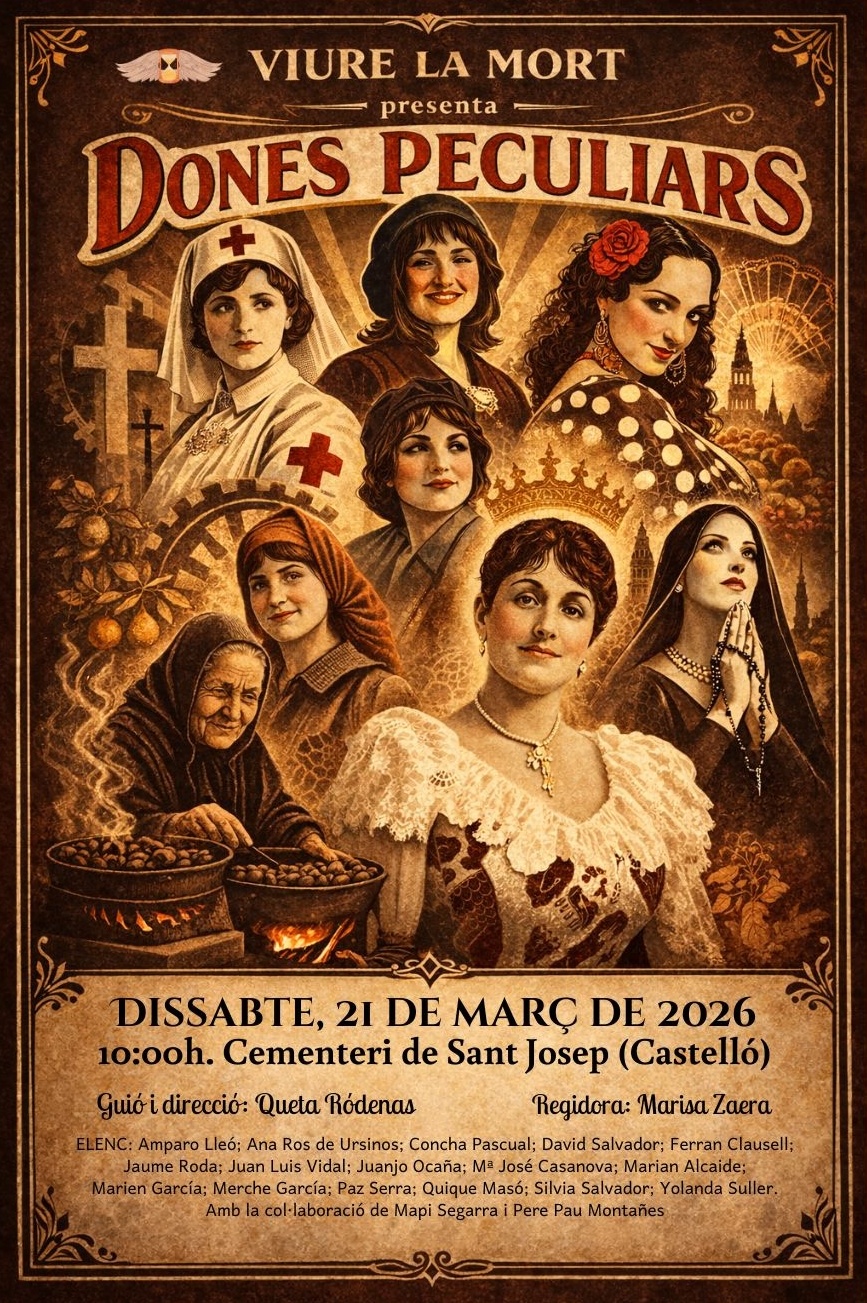 La compañía de teatro amateur Viure la Mort continúa demostrando que las tablas no solo sirven para narrar el pasado, sino también para transformar el presente. Esta mañana, la directora del colectivo, Queta Ródenas, junto a Concha Pascual , una de las actrices del elenco de esta agrupación, han hecho entrega oficial a la Asociación MEF2C de los donativos recaudados durante la función de su exitoso itinerario teatralizado «Dones Peculiars», celebrado este pasado sábado 21 de marzo, en el cementerio de San José de Castellón.